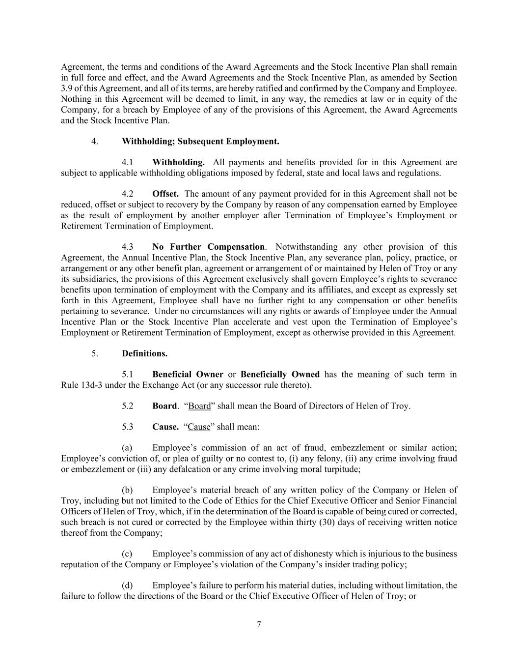 7 Agreement, the terms and conditions of the Award Agreements and the Stock Incentive Plan shall remain in full force and effect, and the Award Agreements and the Stock Incentive Plan, as amended by Section 3.9 of this Agreement, and all of its terms, are hereby ratified and confirmed by the Company and Employee. Nothing in this Agreement will be deemed to limit, in any way, the remedies at law or in equity of the Company, for a breach by Employee of any of the provisions of this Agreement, the Award Agreements and the Stock Incentive Plan. 4. Withholding; Subsequent Employment. 4.1 Withholding. All payments and benefits provided for in this Agreement are subject to applicable withholding obligations imposed by federal, state and local laws and regulations. 4.2 Offset. The amount of any payment provided for in this Agreement shall not be reduced, offset or subject to recovery by the Company by reason of any compensation earned by Employee as the result of employment by another employer after Termination of Employee’s Employment or Retirement Termination of Employment. 4.3 No Further Compensation. Notwithstanding any other provision of this Agreement, the Annual Incentive Plan, the Stock Incentive Plan, any severance plan, policy, practice, or arrangement or any other benefit plan, agreement or arrangement of or maintained by Helen of Troy or any its subsidiaries, the provisions of this Agreement exclusively shall govern Employee’s rights to severance benefits upon termination of employment with the Company and its affiliates, and except as expressly set forth in this Agreement, Employee shall have no further right to any compensation or other benefits pertaining to severance. Under no circumstances will any rights or awards of Employee under the Annual Incentive Plan or the Stock Incentive Plan accelerate and vest upon the Termination of Employee’s Employment or Retirement Termination of Employment, except as otherwise provided in this Agreement. 5. Definitions. 5.1 Beneficial Owner or Beneficially Owned has the meaning of such term in Rule 13d-3 under the Exchange Act (or any successor rule thereto). 5.2 Board. “Board” shall mean the Board of Directors of Helen of Troy. 5.3 Cause. “Cause” shall mean: (a) Employee’s commission of an act of fraud, embezzlement or similar action; Employee’s conviction of, or plea of guilty or no contest to, (i) any felony, (ii) any crime involving fraud or embezzlement or (iii) any defalcation or any crime involving moral turpitude; (b) Employee’s material breach of any written policy of the Company or Helen of Troy, including but not limited to the Code of Ethics for the Chief Executive Officer and Senior Financial Officers of Helen of Troy, which, if in the determination of the Board is capable of being cured or corrected, such breach is not cured or corrected by the Employee within thirty (30) days of receiving written notice thereof from the Company; (c) Employee’s commission of any act of dishonesty which is injurious to the business reputation of the Company or Employee’s violation of the Company’s insider trading policy; (d) Employee’s failure to perform his material duties, including without limitation, the failure to follow the directions of the Board or the Chief Executive Officer of Helen of Troy; or
