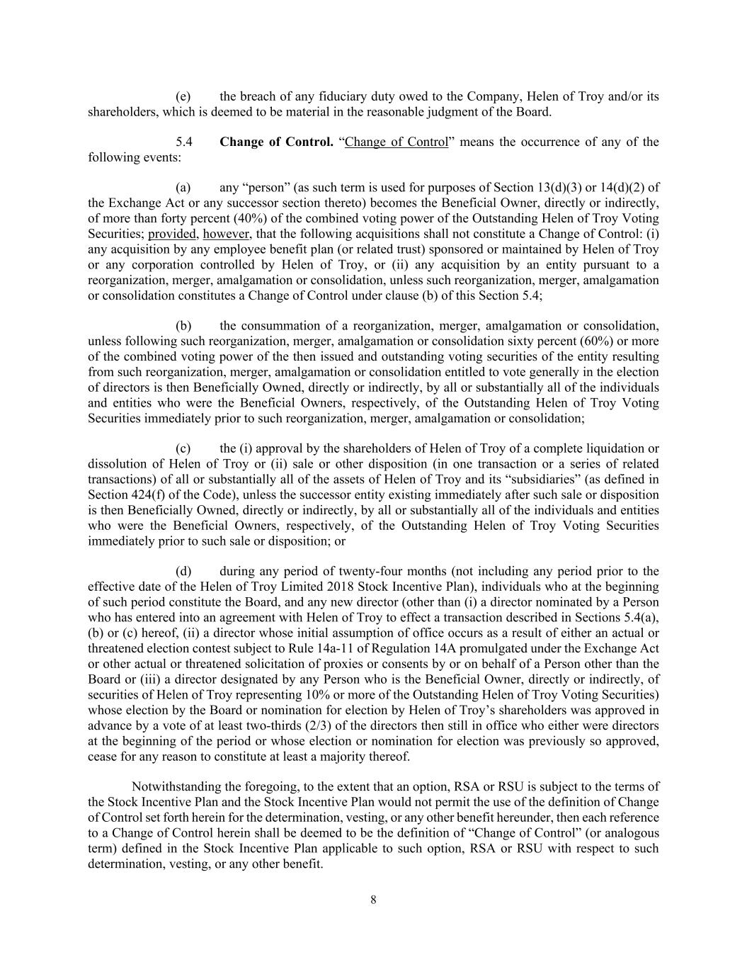 8 (e) the breach of any fiduciary duty owed to the Company, Helen of Troy and/or its shareholders, which is deemed to be material in the reasonable judgment of the Board. 5.4 Change of Control. “Change of Control” means the occurrence of any of the following events: (a) any “person” (as such term is used for purposes of Section 13(d)(3) or 14(d)(2) of the Exchange Act or any successor section thereto) becomes the Beneficial Owner, directly or indirectly, of more than forty percent (40%) of the combined voting power of the Outstanding Helen of Troy Voting Securities; provided, however, that the following acquisitions shall not constitute a Change of Control: (i) any acquisition by any employee benefit plan (or related trust) sponsored or maintained by Helen of Troy or any corporation controlled by Helen of Troy, or (ii) any acquisition by an entity pursuant to a reorganization, merger, amalgamation or consolidation, unless such reorganization, merger, amalgamation or consolidation constitutes a Change of Control under clause (b) of this Section 5.4; (b) the consummation of a reorganization, merger, amalgamation or consolidation, unless following such reorganization, merger, amalgamation or consolidation sixty percent (60%) or more of the combined voting power of the then issued and outstanding voting securities of the entity resulting from such reorganization, merger, amalgamation or consolidation entitled to vote generally in the election of directors is then Beneficially Owned, directly or indirectly, by all or substantially all of the individuals and entities who were the Beneficial Owners, respectively, of the Outstanding Helen of Troy Voting Securities immediately prior to such reorganization, merger, amalgamation or consolidation; (c) the (i) approval by the shareholders of Helen of Troy of a complete liquidation or dissolution of Helen of Troy or (ii) sale or other disposition (in one transaction or a series of related transactions) of all or substantially all of the assets of Helen of Troy and its “subsidiaries” (as defined in Section 424(f) of the Code), unless the successor entity existing immediately after such sale or disposition is then Beneficially Owned, directly or indirectly, by all or substantially all of the individuals and entities who were the Beneficial Owners, respectively, of the Outstanding Helen of Troy Voting Securities immediately prior to such sale or disposition; or (d) during any period of twenty-four months (not including any period prior to the effective date of the Helen of Troy Limited 2018 Stock Incentive Plan), individuals who at the beginning of such period constitute the Board, and any new director (other than (i) a director nominated by a Person who has entered into an agreement with Helen of Troy to effect a transaction described in Sections 5.4(a), (b) or (c) hereof, (ii) a director whose initial assumption of office occurs as a result of either an actual or threatened election contest subject to Rule 14a-11 of Regulation 14A promulgated under the Exchange Act or other actual or threatened solicitation of proxies or consents by or on behalf of a Person other than the Board or (iii) a director designated by any Person who is the Beneficial Owner, directly or indirectly, of securities of Helen of Troy representing 10% or more of the Outstanding Helen of Troy Voting Securities) whose election by the Board or nomination for election by Helen of Troy’s shareholders was approved in advance by a vote of at least two-thirds (2/3) of the directors then still in office who either were directors at the beginning of the period or whose election or nomination for election was previously so approved, cease for any reason to constitute at least a majority thereof. Notwithstanding the foregoing, to the extent that an option, RSA or RSU is subject to the terms of the Stock Incentive Plan and the Stock Incentive Plan would not permit the use of the definition of Change of Control set forth herein for the determination, vesting, or any other benefit hereunder, then each reference to a Change of Control herein shall be deemed to be the definition of “Change of Control” (or analogous term) defined in the Stock Incentive Plan applicable to such option, RSA or RSU with respect to such determination, vesting, or any other benefit.