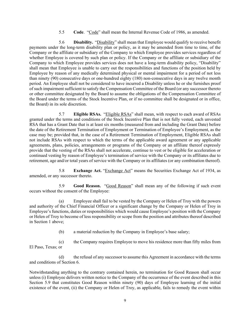 9 5.5 Code. “Code” shall mean the Internal Revenue Code of 1986, as amended. 5.6 Disability. “Disability” shall mean that Employee would qualify to receive benefit payments under the long-term disability plan or policy, as it may be amended from time to time, of the Company or the affiliate or subsidiary of the Company to which Employee provides services regardless of whether Employee is covered by such plan or policy. If the Company or the affiliate or subsidiary of the Company to which Employee provides services does not have a long-term disability policy, “Disability” shall mean that Employee is unable to carry out the responsibilities and functions of the position held by Employee by reason of any medically determined physical or mental impairment for a period of not less than ninety (90) consecutive days or one-hundred eighty (180) non-consecutive days in any twelve month period. An Employee shall not be considered to have incurred a Disability unless he or she furnishes proof of such impairment sufficient to satisfy the Compensation Committee of the Board (or any successor thereto or other committee designated by the Board to assume the obligations of the Compensation Committee of the Board under the terms of the Stock Incentive Plan, or if no committee shall be designated or in office, the Board) in its sole discretion. 5.7 Eligible RSAs. “Eligible RSAs” shall mean, with respect to each award of RSAs granted under the terms and conditions of the Stock Incentive Plan that is not fully vested, each unvested RSA that has a Grant Date that is at least six months (measured from and including the Grant Date) before the date of the Retirement Termination of Employment or Termination of Employee’s Employment, as the case may be; provided that, in the case of a Retirement Termination of Employment, Eligible RSAs shall not include RSAs with respect to which the terms of the applicable award agreement or any applicable agreements, plans, policies, arrangements or programs of the Company or an affiliate thereof expressly provide that the vesting of the RSAs shall not accelerate, continue to vest or be eligible for acceleration or continued vesting by reason of Employee’s termination of service with the Company or its affiliates due to retirement, age and/or total years of service with the Company or its affiliates (or any combination thereof). 5.8 Exchange Act. “Exchange Act” means the Securities Exchange Act of 1934, as amended, or any successor thereto. 5.9 Good Reason. “Good Reason” shall mean any of the following if such event occurs without the consent of the Employee: (a) Employee shall fail to be vested by the Company or Helen of Troy with the powers and authority of the Chief Financial Officer or a significant change by the Company or Helen of Troy in Employee’s functions, duties or responsibilities which would cause Employee’s position with the Company or Helen of Troy to become of less responsibility or scope from the position and attributes thereof described in Section 1 above; (b) a material reduction by the Company in Employee’s base salary; (c) the Company requires Employee to move his residence more than fifty miles from El Paso, Texas; or (d) the refusal of any successor to assume this Agreement in accordance with the terms and conditions of Section 6. Notwithstanding anything to the contrary contained herein, no termination for Good Reason shall occur unless (i) Employee delivers written notice to the Company of the occurrence of the event described in this Section 5.9 that constitutes Good Reason within ninety (90) days of Employee learning of the initial existence of the event, (ii) the Company or Helen of Troy, as applicable, fails to remedy the event within