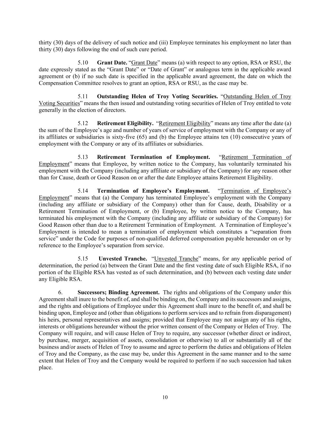 10 thirty (30) days of the delivery of such notice and (iii) Employee terminates his employment no later than thirty (30) days following the end of such cure period. 5.10 Grant Date. “Grant Date” means (a) with respect to any option, RSA or RSU, the date expressly stated as the “Grant Date” or “Date of Grant” or analogous term in the applicable award agreement or (b) if no such date is specified in the applicable award agreement, the date on which the Compensation Committee resolves to grant an option, RSA or RSU, as the case may be. 5.11 Outstanding Helen of Troy Voting Securities. “Outstanding Helen of Troy Voting Securities” means the then issued and outstanding voting securities of Helen of Troy entitled to vote generally in the election of directors. 5.12 Retirement Eligibility. “Retirement Eligibility” means any time after the date (a) the sum of the Employee’s age and number of years of service of employment with the Company or any of its affiliates or subsidiaries is sixty-five (65) and (b) the Employee attains ten (10) consecutive years of employment with the Company or any of its affiliates or subsidiaries. 5.13 Retirement Termination of Employment. “Retirement Termination of Employment” means that Employee, by written notice to the Company, has voluntarily terminated his employment with the Company (including any affiliate or subsidiary of the Company) for any reason other than for Cause, death or Good Reason on or after the date Employee attains Retirement Eligibility. 5.14 Termination of Employee’s Employment. “Termination of Employee’s Employment” means that (a) the Company has terminated Employee’s employment with the Company (including any affiliate or subsidiary of the Company) other than for Cause, death, Disability or a Retirement Termination of Employment, or (b) Employee, by written notice to the Company, has terminated his employment with the Company (including any affiliate or subsidiary of the Company) for Good Reason other than due to a Retirement Termination of Employment. A Termination of Employee’s Employment is intended to mean a termination of employment which constitutes a “separation from service” under the Code for purposes of non-qualified deferred compensation payable hereunder on or by reference to the Employee’s separation from service. 5.15 Unvested Tranche. “Unvested Tranche” means, for any applicable period of determination, the period (a) between the Grant Date and the first vesting date of such Eligible RSA, if no portion of the Eligible RSA has vested as of such determination, and (b) between each vesting date under any Eligible RSA. 6. Successors; Binding Agreement. The rights and obligations of the Company under this Agreement shall inure to the benefit of, and shall be binding on, the Company and its successors and assigns, and the rights and obligations of Employee under this Agreement shall inure to the benefit of, and shall be binding upon, Employee and (other than obligations to perform services and to refrain from disparagement) his heirs, personal representatives and assigns; provided that Employee may not assign any of his rights, interests or obligations hereunder without the prior written consent of the Company or Helen of Troy. The Company will require, and will cause Helen of Troy to require, any successor (whether direct or indirect, by purchase, merger, acquisition of assets, consolidation or otherwise) to all or substantially all of the business and/or assets of Helen of Troy to assume and agree to perform the duties and obligations of Helen of Troy and the Company, as the case may be, under this Agreement in the same manner and to the same extent that Helen of Troy and the Company would be required to perform if no such succession had taken place.