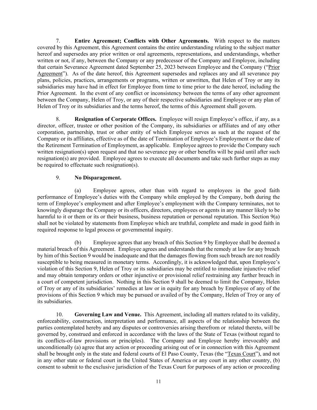 11 7. Entire Agreement; Conflicts with Other Agreements. With respect to the matters covered by this Agreement, this Agreement contains the entire understanding relating to the subject matter hereof and supersedes any prior written or oral agreements, representations, and understandings, whether written or not, if any, between the Company or any predecessor of the Company and Employee, including that certain Severance Agreement dated September 25, 2023 between Employee and the Company (“Prior Agreement”). As of the date hereof, this Agreement supersedes and replaces any and all severance pay plans, policies, practices, arrangements or programs, written or unwritten, that Helen of Troy or any its subsidiaries may have had in effect for Employee from time to time prior to the date hereof, including the Prior Agreement. In the event of any conflict or inconsistency between the terms of any other agreement between the Company, Helen of Troy, or any of their respective subsidiaries and Employee or any plan of Helen of Troy or its subsidiaries and the terms hereof, the terms of this Agreement shall govern. 8. Resignation of Corporate Offices. Employee will resign Employee’s office, if any, as a director, officer, trustee or other position of the Company, its subsidiaries or affiliates and of any other corporation, partnership, trust or other entity of which Employee serves as such at the request of the Company or its affiliates, effective as of the date of Termination of Employee’s Employment or the date of the Retirement Termination of Employment, as applicable. Employee agrees to provide the Company such written resignation(s) upon request and that no severance pay or other benefits will be paid until after such resignation(s) are provided. Employee agrees to execute all documents and take such further steps as may be required to effectuate such resignation(s). 9. No Disparagement. (a) Employee agrees, other than with regard to employees in the good faith performance of Employee’s duties with the Company while employed by the Company, both during the term of Employee’s employment and after Employee’s employment with the Company terminates, not to knowingly disparage the Company or its officers, directors, employees or agents in any manner likely to be harmful to it or them or its or their business, business reputation or personal reputation. This Section 9(a) shall not be violated by statements from Employee which are truthful, complete and made in good faith in required response to legal process or governmental inquiry. (b) Employee agrees that any breach of this Section 9 by Employee shall be deemed a material breach of this Agreement. Employee agrees and understands that the remedy at law for any breach by him of this Section 9 would be inadequate and that the damages flowing from such breach are not readily susceptible to being measured in monetary terms. Accordingly, it is acknowledged that, upon Employee’s violation of this Section 9, Helen of Troy or its subsidiaries may be entitled to immediate injunctive relief and may obtain temporary orders or other injunctive or provisional relief restraining any further breach in a court of competent jurisdiction. Nothing in this Section 9 shall be deemed to limit the Company, Helen of Troy or any of its subsidiaries’ remedies at law or in equity for any breach by Employee of any of the provisions of this Section 9 which may be pursued or availed of by the Company, Helen of Troy or any of its subsidiaries. 10. Governing Law and Venue. This Agreement, including all matters related to its validity, enforceability, construction, interpretation and performance, all aspects of the relationship between the parties contemplated hereby and any disputes or controversies arising therefrom or related thereto, will be governed by, construed and enforced in accordance with the laws of the State of Texas (without regard to its conflicts-of-law provisions or principles). The Company and Employee hereby irrevocably and unconditionally (a) agree that any action or proceeding arising out of or in connection with this Agreement shall be brought only in the state and federal courts of El Paso County, Texas (the “Texas Court”), and not in any other state or federal court in the United States of America or any court in any other country, (b) consent to submit to the exclusive jurisdiction of the Texas Court for purposes of any action or proceeding