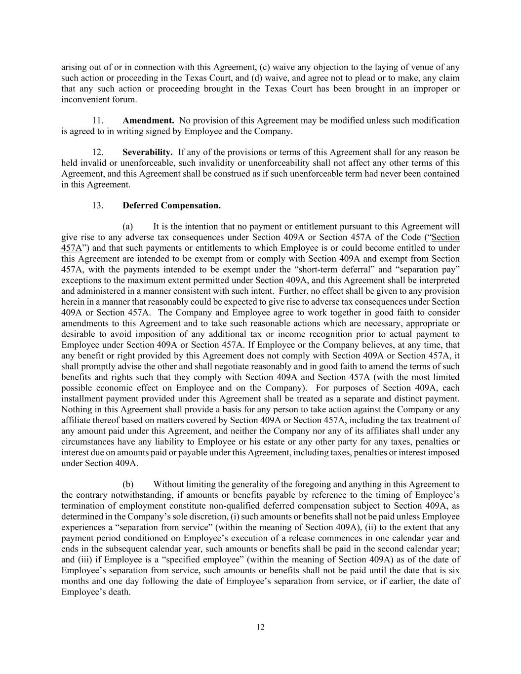12 arising out of or in connection with this Agreement, (c) waive any objection to the laying of venue of any such action or proceeding in the Texas Court, and (d) waive, and agree not to plead or to make, any claim that any such action or proceeding brought in the Texas Court has been brought in an improper or inconvenient forum. 11. Amendment. No provision of this Agreement may be modified unless such modification is agreed to in writing signed by Employee and the Company. 12. Severability. If any of the provisions or terms of this Agreement shall for any reason be held invalid or unenforceable, such invalidity or unenforceability shall not affect any other terms of this Agreement, and this Agreement shall be construed as if such unenforceable term had never been contained in this Agreement. 13. Deferred Compensation. (a) It is the intention that no payment or entitlement pursuant to this Agreement will give rise to any adverse tax consequences under Section 409A or Section 457A of the Code (“Section 457A”) and that such payments or entitlements to which Employee is or could become entitled to under this Agreement are intended to be exempt from or comply with Section 409A and exempt from Section 457A, with the payments intended to be exempt under the “short-term deferral” and “separation pay” exceptions to the maximum extent permitted under Section 409A, and this Agreement shall be interpreted and administered in a manner consistent with such intent. Further, no effect shall be given to any provision herein in a manner that reasonably could be expected to give rise to adverse tax consequences under Section 409A or Section 457A. The Company and Employee agree to work together in good faith to consider amendments to this Agreement and to take such reasonable actions which are necessary, appropriate or desirable to avoid imposition of any additional tax or income recognition prior to actual payment to Employee under Section 409A or Section 457A. If Employee or the Company believes, at any time, that any benefit or right provided by this Agreement does not comply with Section 409A or Section 457A, it shall promptly advise the other and shall negotiate reasonably and in good faith to amend the terms of such benefits and rights such that they comply with Section 409A and Section 457A (with the most limited possible economic effect on Employee and on the Company). For purposes of Section 409A, each installment payment provided under this Agreement shall be treated as a separate and distinct payment. Nothing in this Agreement shall provide a basis for any person to take action against the Company or any affiliate thereof based on matters covered by Section 409A or Section 457A, including the tax treatment of any amount paid under this Agreement, and neither the Company nor any of its affiliates shall under any circumstances have any liability to Employee or his estate or any other party for any taxes, penalties or interest due on amounts paid or payable under this Agreement, including taxes, penalties or interest imposed under Section 409A. (b) Without limiting the generality of the foregoing and anything in this Agreement to the contrary notwithstanding, if amounts or benefits payable by reference to the timing of Employee’s termination of employment constitute non-qualified deferred compensation subject to Section 409A, as determined in the Company’s sole discretion, (i) such amounts or benefits shall not be paid unless Employee experiences a “separation from service” (within the meaning of Section 409A), (ii) to the extent that any payment period conditioned on Employee’s execution of a release commences in one calendar year and ends in the subsequent calendar year, such amounts or benefits shall be paid in the second calendar year; and (iii) if Employee is a “specified employee” (within the meaning of Section 409A) as of the date of Employee’s separation from service, such amounts or benefits shall not be paid until the date that is six months and one day following the date of Employee’s separation from service, or if earlier, the date of Employee’s death.