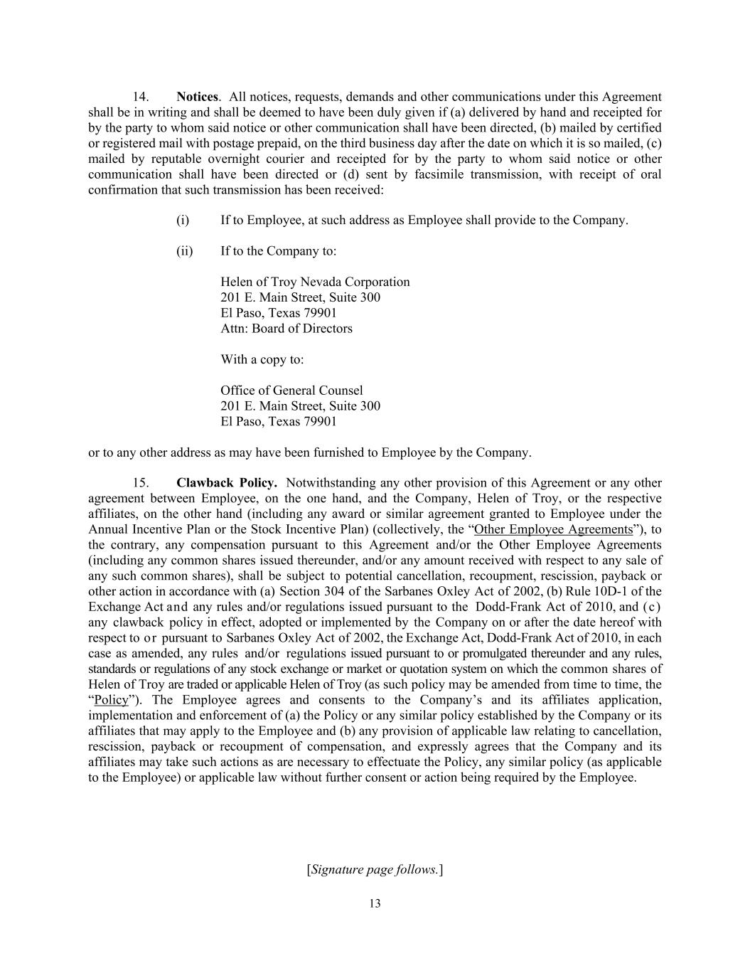 13 14. Notices. All notices, requests, demands and other communications under this Agreement shall be in writing and shall be deemed to have been duly given if (a) delivered by hand and receipted for by the party to whom said notice or other communication shall have been directed, (b) mailed by certified or registered mail with postage prepaid, on the third business day after the date on which it is so mailed, (c) mailed by reputable overnight courier and receipted for by the party to whom said notice or other communication shall have been directed or (d) sent by facsimile transmission, with receipt of oral confirmation that such transmission has been received: (i) If to Employee, at such address as Employee shall provide to the Company. (ii) If to the Company to: Helen of Troy Nevada Corporation 201 E. Main Street, Suite 300 El Paso, Texas 79901 Attn: Board of Directors With a copy to: Office of General Counsel 201 E. Main Street, Suite 300 El Paso, Texas 79901 or to any other address as may have been furnished to Employee by the Company. 15. Clawback Policy. Notwithstanding any other provision of this Agreement or any other agreement between Employee, on the one hand, and the Company, Helen of Troy, or the respective affiliates, on the other hand (including any award or similar agreement granted to Employee under the Annual Incentive Plan or the Stock Incentive Plan) (collectively, the “Other Employee Agreements”), to the contrary, any compensation pursuant to this Agreement and/or the Other Employee Agreements (including any common shares issued thereunder, and/or any amount received with respect to any sale of any such common shares), shall be subject to potential cancellation, recoupment, rescission, payback or other action in accordance with (a) Section 304 of the Sarbanes Oxley Act of 2002, (b) Rule 10D-1 of the Exchange Act and any rules and/or regulations issued pursuant to the Dodd-Frank Act of 2010, and (c) any clawback policy in effect, adopted or implemented by the Company on or after the date hereof with respect to or pursuant to Sarbanes Oxley Act of 2002, the Exchange Act, Dodd-Frank Act of 2010, in each case as amended, any rules and/or regulations issued pursuant to or promulgated thereunder and any rules, standards or regulations of any stock exchange or market or quotation system on which the common shares of Helen of Troy are traded or applicable Helen of Troy (as such policy may be amended from time to time, the “Policy”). The Employee agrees and consents to the Company’s and its affiliates application, implementation and enforcement of (a) the Policy or any similar policy established by the Company or its affiliates that may apply to the Employee and (b) any provision of applicable law relating to cancellation, rescission, payback or recoupment of compensation, and expressly agrees that the Company and its affiliates may take such actions as are necessary to effectuate the Policy, any similar policy (as applicable to the Employee) or applicable law without further consent or action being required by the Employee. [Signature page follows.]