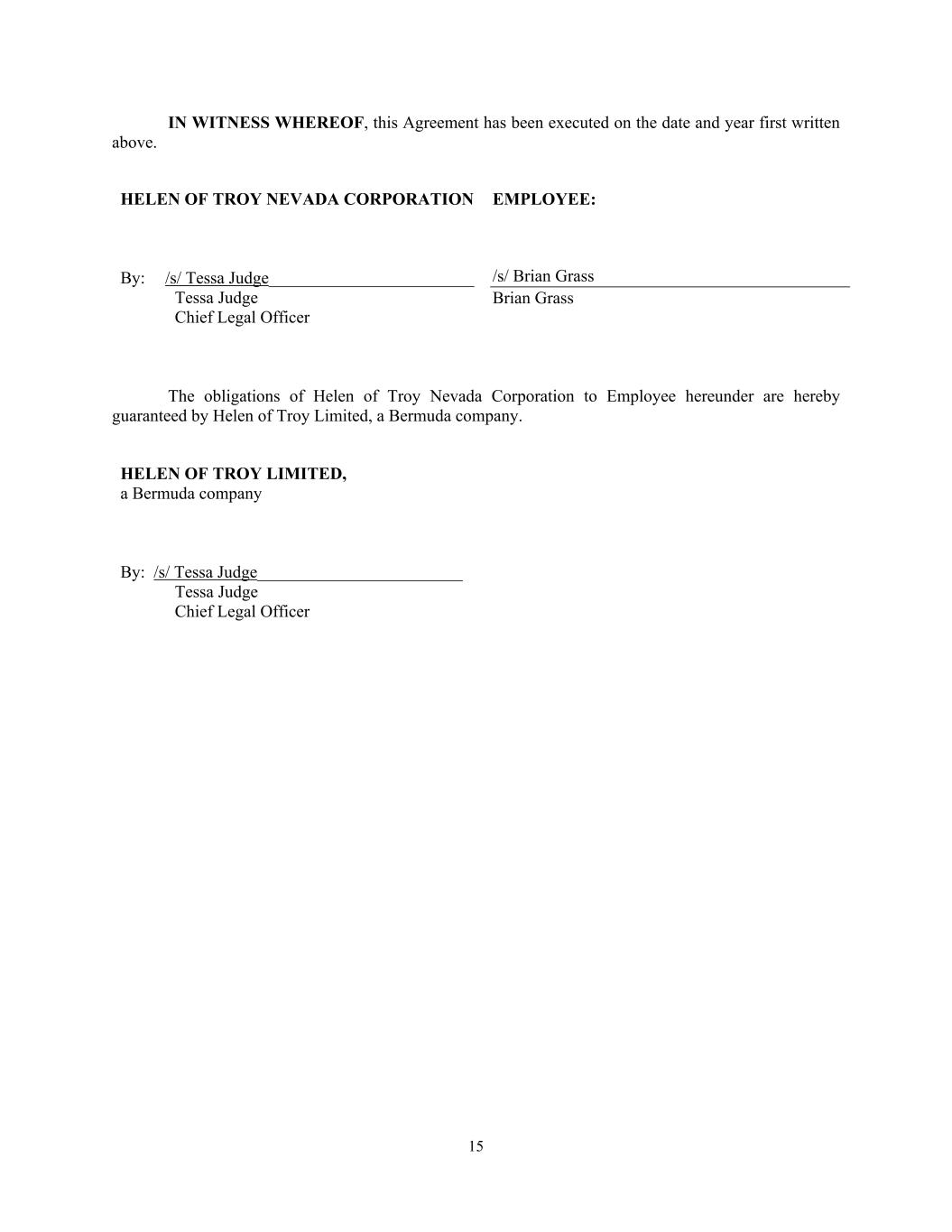 15 IN WITNESS WHEREOF, this Agreement has been executed on the date and year first written above. HELEN OF TROY NEVADA CORPORATION By: /s/ Tessa Judge________________________ Tessa Judge Chief Legal Officer EMPLOYEE: /s/ Brian Grass Brian Grass The obligations of Helen of Troy Nevada Corporation to Employee hereunder are hereby guaranteed by Helen of Troy Limited, a Bermuda company. HELEN OF TROY LIMITED, a Bermuda company By: /s/ Tessa Judge________________________ Tessa Judge Chief Legal Officer