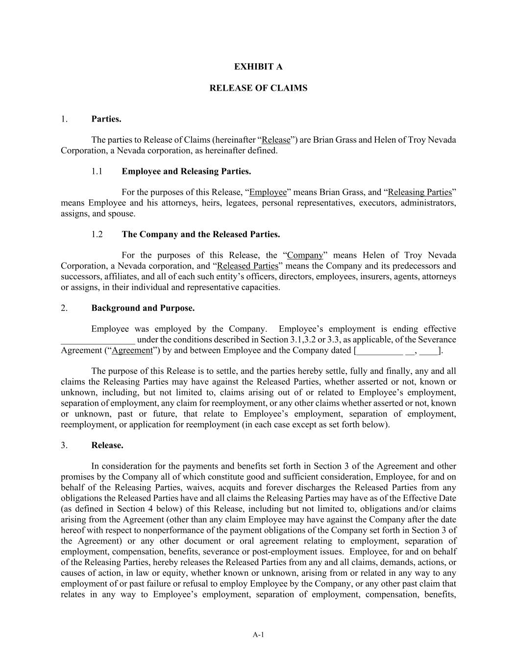 A-1 EXHIBIT A RELEASE OF CLAIMS 1. Parties. The parties to Release of Claims (hereinafter “Release”) are Brian Grass and Helen of Troy Nevada Corporation, a Nevada corporation, as hereinafter defined. 1.1 Employee and Releasing Parties. For the purposes of this Release, “Employee” means Brian Grass, and “Releasing Parties” means Employee and his attorneys, heirs, legatees, personal representatives, executors, administrators, assigns, and spouse. 1.2 The Company and the Released Parties. For the purposes of this Release, the “Company” means Helen of Troy Nevada Corporation, a Nevada corporation, and “Released Parties” means the Company and its predecessors and successors, affiliates, and all of each such entity’s officers, directors, employees, insurers, agents, attorneys or assigns, in their individual and representative capacities. 2. Background and Purpose. Employee was employed by the Company. Employee’s employment is ending effective ________________ under the conditions described in Section 3.1,3.2 or 3.3, as applicable, of the Severance Agreement (“Agreement”) by and between Employee and the Company dated [__________ __, ____]. The purpose of this Release is to settle, and the parties hereby settle, fully and finally, any and all claims the Releasing Parties may have against the Released Parties, whether asserted or not, known or unknown, including, but not limited to, claims arising out of or related to Employee’s employment, separation of employment, any claim for reemployment, or any other claims whether asserted or not, known or unknown, past or future, that relate to Employee’s employment, separation of employment, reemployment, or application for reemployment (in each case except as set forth below). 3. Release. In consideration for the payments and benefits set forth in Section 3 of the Agreement and other promises by the Company all of which constitute good and sufficient consideration, Employee, for and on behalf of the Releasing Parties, waives, acquits and forever discharges the Released Parties from any obligations the Released Parties have and all claims the Releasing Parties may have as of the Effective Date (as defined in Section 4 below) of this Release, including but not limited to, obligations and/or claims arising from the Agreement (other than any claim Employee may have against the Company after the date hereof with respect to nonperformance of the payment obligations of the Company set forth in Section 3 of the Agreement) or any other document or oral agreement relating to employment, separation of employment, compensation, benefits, severance or post-employment issues. Employee, for and on behalf of the Releasing Parties, hereby releases the Released Parties from any and all claims, demands, actions, or causes of action, in law or equity, whether known or unknown, arising from or related in any way to any employment of or past failure or refusal to employ Employee by the Company, or any other past claim that relates in any way to Employee’s employment, separation of employment, compensation, benefits,
