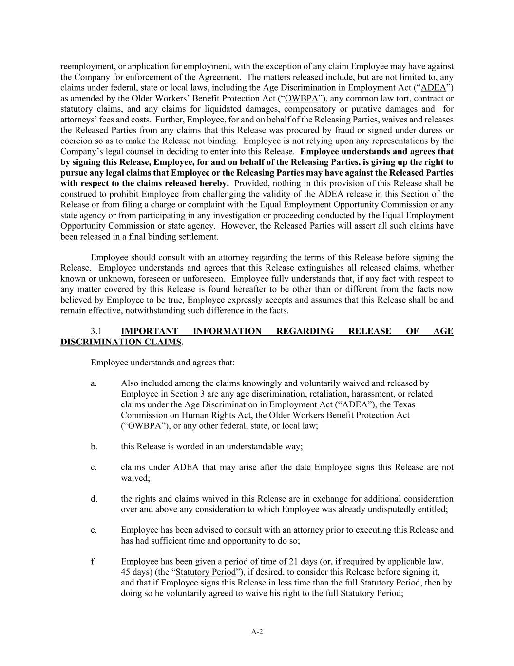 A-2 reemployment, or application for employment, with the exception of any claim Employee may have against the Company for enforcement of the Agreement. The matters released include, but are not limited to, any claims under federal, state or local laws, including the Age Discrimination in Employment Act (“ADEA”) as amended by the Older Workers’ Benefit Protection Act (“OWBPA”), any common law tort, contract or statutory claims, and any claims for liquidated damages, compensatory or putative damages and for attorneys’ fees and costs. Further, Employee, for and on behalf of the Releasing Parties, waives and releases the Released Parties from any claims that this Release was procured by fraud or signed under duress or coercion so as to make the Release not binding. Employee is not relying upon any representations by the Company’s legal counsel in deciding to enter into this Release. Employee understands and agrees that by signing this Release, Employee, for and on behalf of the Releasing Parties, is giving up the right to pursue any legal claims that Employee or the Releasing Parties may have against the Released Parties with respect to the claims released hereby. Provided, nothing in this provision of this Release shall be construed to prohibit Employee from challenging the validity of the ADEA release in this Section of the Release or from filing a charge or complaint with the Equal Employment Opportunity Commission or any state agency or from participating in any investigation or proceeding conducted by the Equal Employment Opportunity Commission or state agency. However, the Released Parties will assert all such claims have been released in a final binding settlement. Employee should consult with an attorney regarding the terms of this Release before signing the Release. Employee understands and agrees that this Release extinguishes all released claims, whether known or unknown, foreseen or unforeseen. Employee fully understands that, if any fact with respect to any matter covered by this Release is found hereafter to be other than or different from the facts now believed by Employee to be true, Employee expressly accepts and assumes that this Release shall be and remain effective, notwithstanding such difference in the facts. 3.1 IMPORTANT INFORMATION REGARDING RELEASE OF AGE DISCRIMINATION CLAIMS. Employee understands and agrees that: a. Also included among the claims knowingly and voluntarily waived and released by Employee in Section 3 are any age discrimination, retaliation, harassment, or related claims under the Age Discrimination in Employment Act (“ADEA”), the Texas Commission on Human Rights Act, the Older Workers Benefit Protection Act (“OWBPA”), or any other federal, state, or local law; b. this Release is worded in an understandable way; c. claims under ADEA that may arise after the date Employee signs this Release are not waived; d. the rights and claims waived in this Release are in exchange for additional consideration over and above any consideration to which Employee was already undisputedly entitled; e. Employee has been advised to consult with an attorney prior to executing this Release and has had sufficient time and opportunity to do so; f. Employee has been given a period of time of 21 days (or, if required by applicable law, 45 days) (the “Statutory Period”), if desired, to consider this Release before signing it, and that if Employee signs this Release in less time than the full Statutory Period, then by doing so he voluntarily agreed to waive his right to the full Statutory Period;