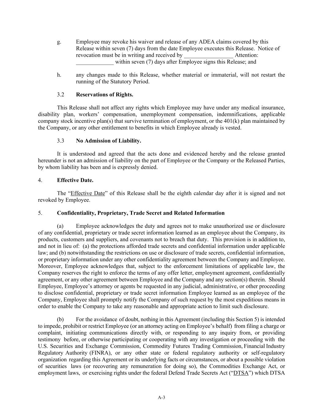A-3 g. Employee may revoke his waiver and release of any ADEA claims covered by this Release within seven (7) days from the date Employee executes this Release. Notice of revocation must be in writing and received by _________________ Attention: _____________ within seven (7) days after Employee signs this Release; and h. any changes made to this Release, whether material or immaterial, will not restart the running of the Statutory Period. 3.2 Reservations of Rights. This Release shall not affect any rights which Employee may have under any medical insurance, disability plan, workers’ compensation, unemployment compensation, indemnifications, applicable company stock incentive plan(s) that survive termination of employment, or the 401(k) plan maintained by the Company, or any other entitlement to benefits in which Employee already is vested. 3.3 No Admission of Liability. It is understood and agreed that the acts done and evidenced hereby and the release granted hereunder is not an admission of liability on the part of Employee or the Company or the Released Parties, by whom liability has been and is expressly denied. 4. Effective Date. The “Effective Date” of this Release shall be the eighth calendar day after it is signed and not revoked by Employee. 5. Confidentiality, Proprietary, Trade Secret and Related Information (a) Employee acknowledges the duty and agrees not to make unauthorized use or disclosure of any confidential, proprietary or trade secret information learned as an employee about the Company, its products, customers and suppliers, and covenants not to breach that duty. This provision is in addition to, and not in lieu of: (a) the protections afforded trade secrets and confidential information under applicable law; and (b) notwithstanding the restrictions on use or disclosure of trade secrets, confidential information, or proprietary information under any other confidentiality agreement between the Company and Employee. Moreover, Employee acknowledges that, subject to the enforcement limitations of applicable law, the Company reserves the right to enforce the terms of any offer letter, employment agreement, confidentially agreement, or any other agreement between Employee and the Company and any section(s) therein. Should Employee, Employee’s attorney or agents be requested in any judicial, administrative, or other proceeding to disclose confidential, proprietary or trade secret information Employee learned as an employee of the Company, Employee shall promptly notify the Company of such request by the most expeditious means in order to enable the Company to take any reasonable and appropriate action to limit such disclosure. (b) For the avoidance of doubt, nothing in this Agreement (including this Section 5) is intended to impede, prohibit or restrict Employee (or an attorney acting on Employee’s behalf) from filing a charge or complaint, initiating communications directly with, or responding to any inquiry from, or providing testimony before, or otherwise participating or cooperating with any investigation or proceeding with the U.S. Securities and Exchange Commission, Commodity Futures Trading Commission, Financial Industry Regulatory Authority (FINRA), or any other state or federal regulatory authority or self-regulatory organization regarding this Agreement or its underlying facts or circumstances, or about a possible violation of securities laws (or recovering any remuneration for doing so), the Commodities Exchange Act, or employment laws, or exercising rights under the federal Defend Trade Secrets Act (“DTSA”) which DTSA