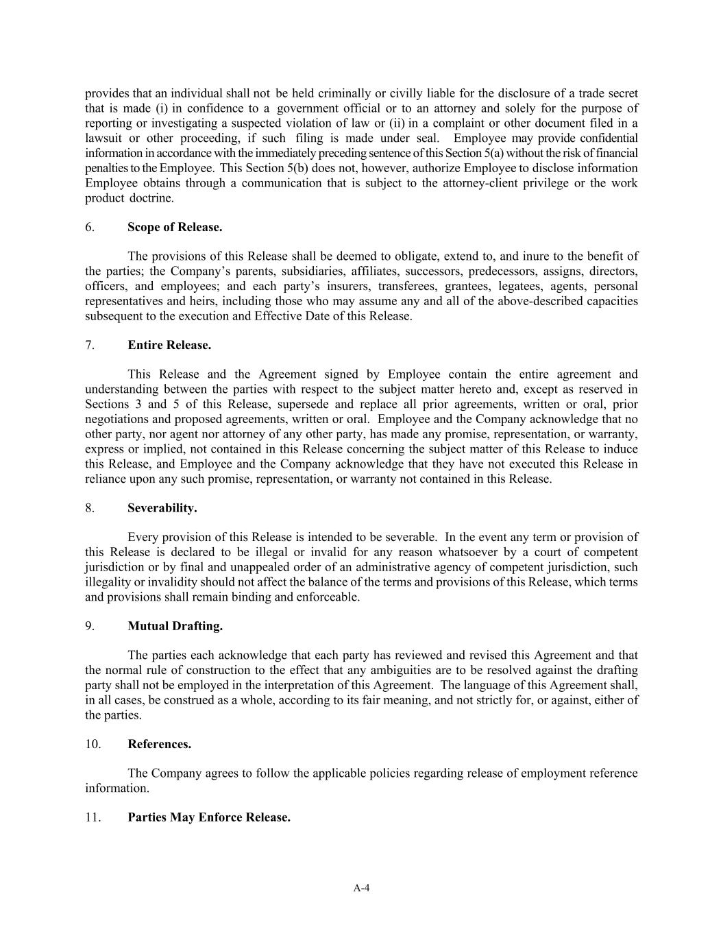 A-4 provides that an individual shall not be held criminally or civilly liable for the disclosure of a trade secret that is made (i) in confidence to a government official or to an attorney and solely for the purpose of reporting or investigating a suspected violation of law or (ii) in a complaint or other document filed in a lawsuit or other proceeding, if such filing is made under seal. Employee may provide confidential information in accordance with the immediately preceding sentence of this Section 5(a) without the risk of financial penalties to the Employee. This Section 5(b) does not, however, authorize Employee to disclose information Employee obtains through a communication that is subject to the attorney-client privilege or the work product doctrine. 6. Scope of Release. The provisions of this Release shall be deemed to obligate, extend to, and inure to the benefit of the parties; the Company’s parents, subsidiaries, affiliates, successors, predecessors, assigns, directors, officers, and employees; and each party’s insurers, transferees, grantees, legatees, agents, personal representatives and heirs, including those who may assume any and all of the above-described capacities subsequent to the execution and Effective Date of this Release. 7. Entire Release. This Release and the Agreement signed by Employee contain the entire agreement and understanding between the parties with respect to the subject matter hereto and, except as reserved in Sections 3 and 5 of this Release, supersede and replace all prior agreements, written or oral, prior negotiations and proposed agreements, written or oral. Employee and the Company acknowledge that no other party, nor agent nor attorney of any other party, has made any promise, representation, or warranty, express or implied, not contained in this Release concerning the subject matter of this Release to induce this Release, and Employee and the Company acknowledge that they have not executed this Release in reliance upon any such promise, representation, or warranty not contained in this Release. 8. Severability. Every provision of this Release is intended to be severable. In the event any term or provision of this Release is declared to be illegal or invalid for any reason whatsoever by a court of competent jurisdiction or by final and unappealed order of an administrative agency of competent jurisdiction, such illegality or invalidity should not affect the balance of the terms and provisions of this Release, which terms and provisions shall remain binding and enforceable. 9. Mutual Drafting. The parties each acknowledge that each party has reviewed and revised this Agreement and that the normal rule of construction to the effect that any ambiguities are to be resolved against the drafting party shall not be employed in the interpretation of this Agreement. The language of this Agreement shall, in all cases, be construed as a whole, according to its fair meaning, and not strictly for, or against, either of the parties. 10. References. The Company agrees to follow the applicable policies regarding release of employment reference information. 11. Parties May Enforce Release.