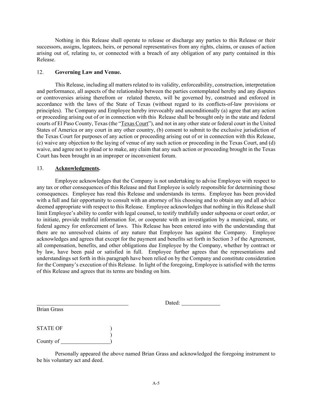 A-5 Nothing in this Release shall operate to release or discharge any parties to this Release or their successors, assigns, legatees, heirs, or personal representatives from any rights, claims, or causes of action arising out of, relating to, or connected with a breach of any obligation of any party contained in this Release. 12. Governing Law and Venue. This Release, including all matters related to its validity, enforceability, construction, interpretation and performance, all aspects of the relationship between the parties contemplated hereby and any disputes or controversies arising therefrom or related thereto, will be governed by, construed and enforced in accordance with the laws of the State of Texas (without regard to its conflicts-of-law provisions or principles). The Company and Employee hereby irrevocably and unconditionally (a) agree that any action or proceeding arising out of or in connection with this Release shall be brought only in the state and federal courts of El Paso County, Texas (the “Texas Court”), and not in any other state or federal court in the United States of America or any court in any other country, (b) consent to submit to the exclusive jurisdiction of the Texas Court for purposes of any action or proceeding arising out of or in connection with this Release, (c) waive any objection to the laying of venue of any such action or proceeding in the Texas Court, and (d) waive, and agree not to plead or to make, any claim that any such action or proceeding brought in the Texas Court has been brought in an improper or inconvenient forum. 13. Acknowledgments. Employee acknowledges that the Company is not undertaking to advise Employee with respect to any tax or other consequences of this Release and that Employee is solely responsible for determining those consequences. Employee has read this Release and understands its terms. Employee has been provided with a full and fair opportunity to consult with an attorney of his choosing and to obtain any and all advice deemed appropriate with respect to this Release. Employee acknowledges that nothing in this Release shall limit Employee’s ability to confer with legal counsel, to testify truthfully under subpoena or court order, or to initiate, provide truthful information for, or cooperate with an investigation by a municipal, state, or federal agency for enforcement of laws. This Release has been entered into with the understanding that there are no unresolved claims of any nature that Employee has against the Company. Employee acknowledges and agrees that except for the payment and benefits set forth in Section 3 of the Agreement, all compensation, benefits, and other obligations due Employee by the Company, whether by contract or by law, have been paid or satisfied in full. Employee further agrees that the representations and understandings set forth in this paragraph have been relied on by the Company and constitute consideration for the Company’s execution of this Release. In light of the foregoing, Employee is satisfied with the terms of this Release and agrees that its terms are binding on him. Dated: Brian Grass STATE OF ) ) County of ) Personally appeared the above named Brian Grass and acknowledged the foregoing instrument to be his voluntary act and deed.