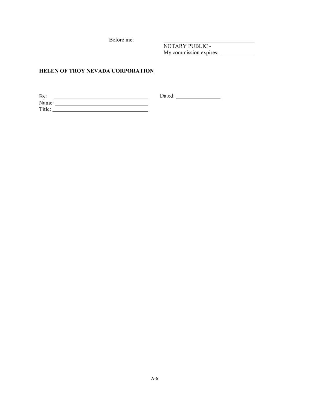 A-6 Before me: NOTARY PUBLIC - My commission expires: HELEN OF TROY NEVADA CORPORATION By: Name: Title: Dated: