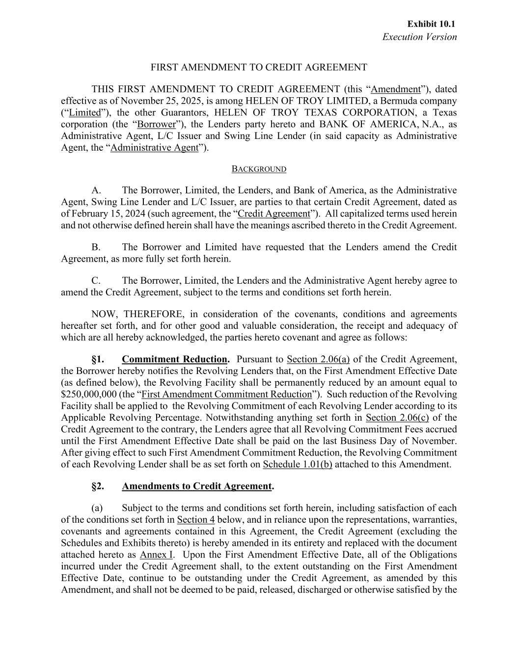Execution Version FIRST AMENDMENT TO CREDIT AGREEMENT THIS FIRST AMENDMENT TO CREDIT AGREEMENT (this “Amendment”), dated effective as of November 25, 2025, is among HELEN OF TROY LIMITED, a Bermuda company (“Limited”), the other Guarantors, HELEN OF TROY TEXAS CORPORATION, a Texas corporation (the “Borrower”), the Lenders party hereto and BANK OF AMERICA, N.A., as Administrative Agent, L/C Issuer and Swing Line Lender (in said capacity as Administrative Agent, the “Administrative Agent”). BACKGROUND A. The Borrower, Limited, the Lenders, and Bank of America, as the Administrative Agent, Swing Line Lender and L/C Issuer, are parties to that certain Credit Agreement, dated as of February 15, 2024 (such agreement, the “Credit Agreement”). All capitalized terms used herein and not otherwise defined herein shall have the meanings ascribed thereto in the Credit Agreement. B. The Borrower and Limited have requested that the Lenders amend the Credit Agreement, as more fully set forth herein. C. The Borrower, Limited, the Lenders and the Administrative Agent hereby agree to amend the Credit Agreement, subject to the terms and conditions set forth herein. NOW, THEREFORE, in consideration of the covenants, conditions and agreements hereafter set forth, and for other good and valuable consideration, the receipt and adequacy of which are all hereby acknowledged, the parties hereto covenant and agree as follows: §1. Commitment Reduction. Pursuant to Section 2.06(a) of the Credit Agreement, the Borrower hereby notifies the Revolving Lenders that, on the First Amendment Effective Date (as defined below), the Revolving Facility shall be permanently reduced by an amount equal to $250,000,000 (the “First Amendment Commitment Reduction”). Such reduction of the Revolving Facility shall be applied to the Revolving Commitment of each Revolving Lender according to its Applicable Revolving Percentage. Notwithstanding anything set forth in Section 2.06(c) of the Credit Agreement to the contrary, the Lenders agree that all Revolving Commitment Fees accrued until the First Amendment Effective Date shall be paid on the last Business Day of November. After giving effect to such First Amendment Commitment Reduction, the Revolving Commitment of each Revolving Lender shall be as set forth on Schedule 1.01(b) attached to this Amendment. §2. Amendments to Credit Agreement. (a) Subject to the terms and conditions set forth herein, including satisfaction of each of the conditions set forth in Section 4 below, and in reliance upon the representations, warranties, covenants and agreements contained in this Agreement, the Credit Agreement (excluding the Schedules and Exhibits thereto) is hereby amended in its entirety and replaced with the document attached hereto as Annex I. Upon the First Amendment Effective Date, all of the Obligations incurred under the Credit Agreement shall, to the extent outstanding on the First Amendment Effective Date, continue to be outstanding under the Credit Agreement, as amended by this Amendment, and shall not be deemed to be paid, released, discharged or otherwise satisfied by the Exhibit 10.1