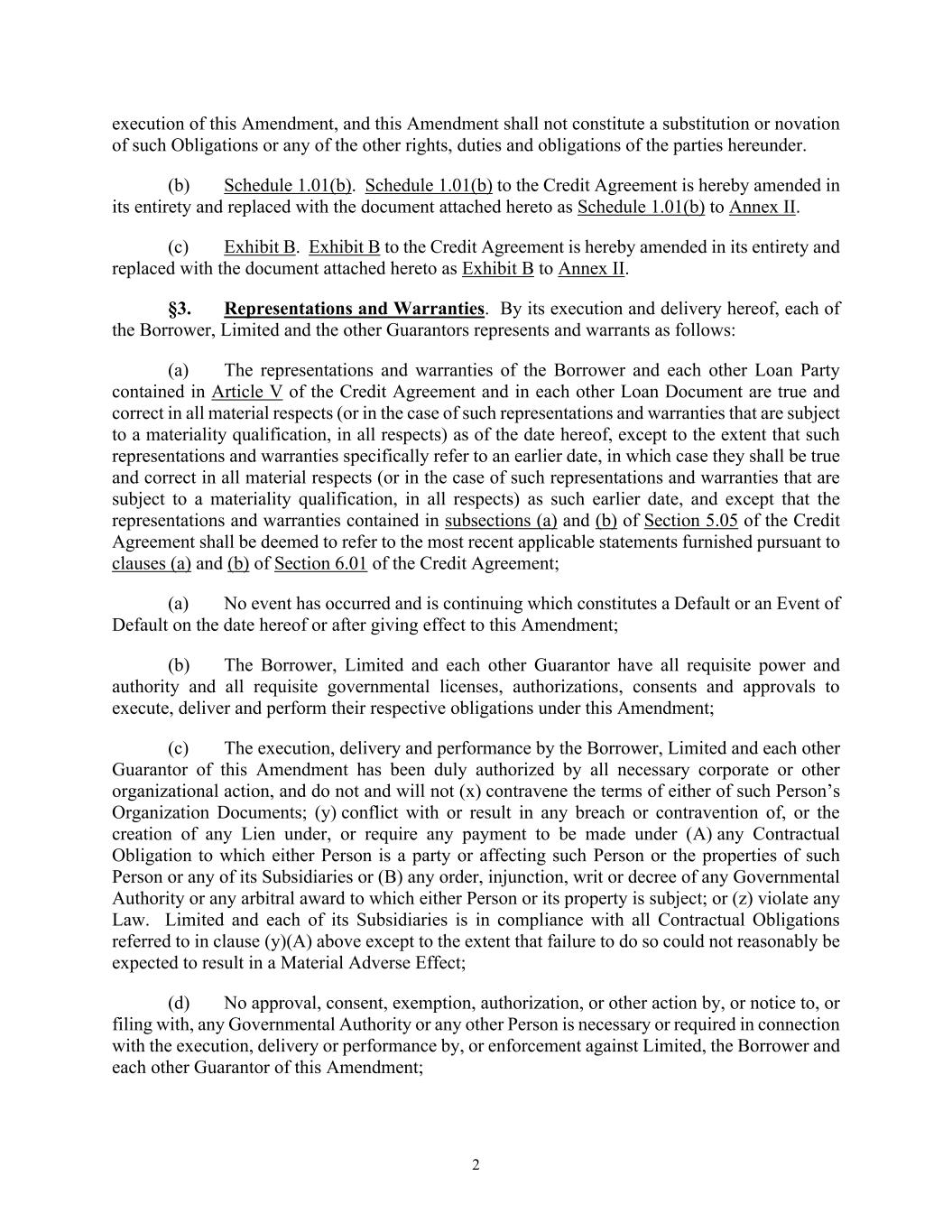 2 execution of this Amendment, and this Amendment shall not constitute a substitution or novation of such Obligations or any of the other rights, duties and obligations of the parties hereunder. (b) Schedule 1.01(b). Schedule 1.01(b) to the Credit Agreement is hereby amended in its entirety and replaced with the document attached hereto as Schedule 1.01(b) to Annex II. (c) Exhibit B. Exhibit B to the Credit Agreement is hereby amended in its entirety and replaced with the document attached hereto as Exhibit B to Annex II. §3. Representations and Warranties. By its execution and delivery hereof, each of the Borrower, Limited and the other Guarantors represents and warrants as follows: (a) The representations and warranties of the Borrower and each other Loan Party contained in Article V of the Credit Agreement and in each other Loan Document are true and correct in all material respects (or in the case of such representations and warranties that are subject to a materiality qualification, in all respects) as of the date hereof, except to the extent that such representations and warranties specifically refer to an earlier date, in which case they shall be true and correct in all material respects (or in the case of such representations and warranties that are subject to a materiality qualification, in all respects) as such earlier date, and except that the representations and warranties contained in subsections (a) and (b) of Section 5.05 of the Credit Agreement shall be deemed to refer to the most recent applicable statements furnished pursuant to clauses (a) and (b) of Section 6.01 of the Credit Agreement; (a) No event has occurred and is continuing which constitutes a Default or an Event of Default on the date hereof or after giving effect to this Amendment; (b) The Borrower, Limited and each other Guarantor have all requisite power and authority and all requisite governmental licenses, authorizations, consents and approvals to execute, deliver and perform their respective obligations under this Amendment; (c) The execution, delivery and performance by the Borrower, Limited and each other Guarantor of this Amendment has been duly authorized by all necessary corporate or other organizational action, and do not and will not (x) contravene the terms of either of such Person’s Organization Documents; (y) conflict with or result in any breach or contravention of, or the creation of any Lien under, or require any payment to be made under (A) any Contractual Obligation to which either Person is a party or affecting such Person or the properties of such Person or any of its Subsidiaries or (B) any order, injunction, writ or decree of any Governmental Authority or any arbitral award to which either Person or its property is subject; or (z) violate any Law. Limited and each of its Subsidiaries is in compliance with all Contractual Obligations referred to in clause (y)(A) above except to the extent that failure to do so could not reasonably be expected to result in a Material Adverse Effect; (d) No approval, consent, exemption, authorization, or other action by, or notice to, or filing with, any Governmental Authority or any other Person is necessary or required in connection with the execution, delivery or performance by, or enforcement against Limited, the Borrower and each other Guarantor of this Amendment;