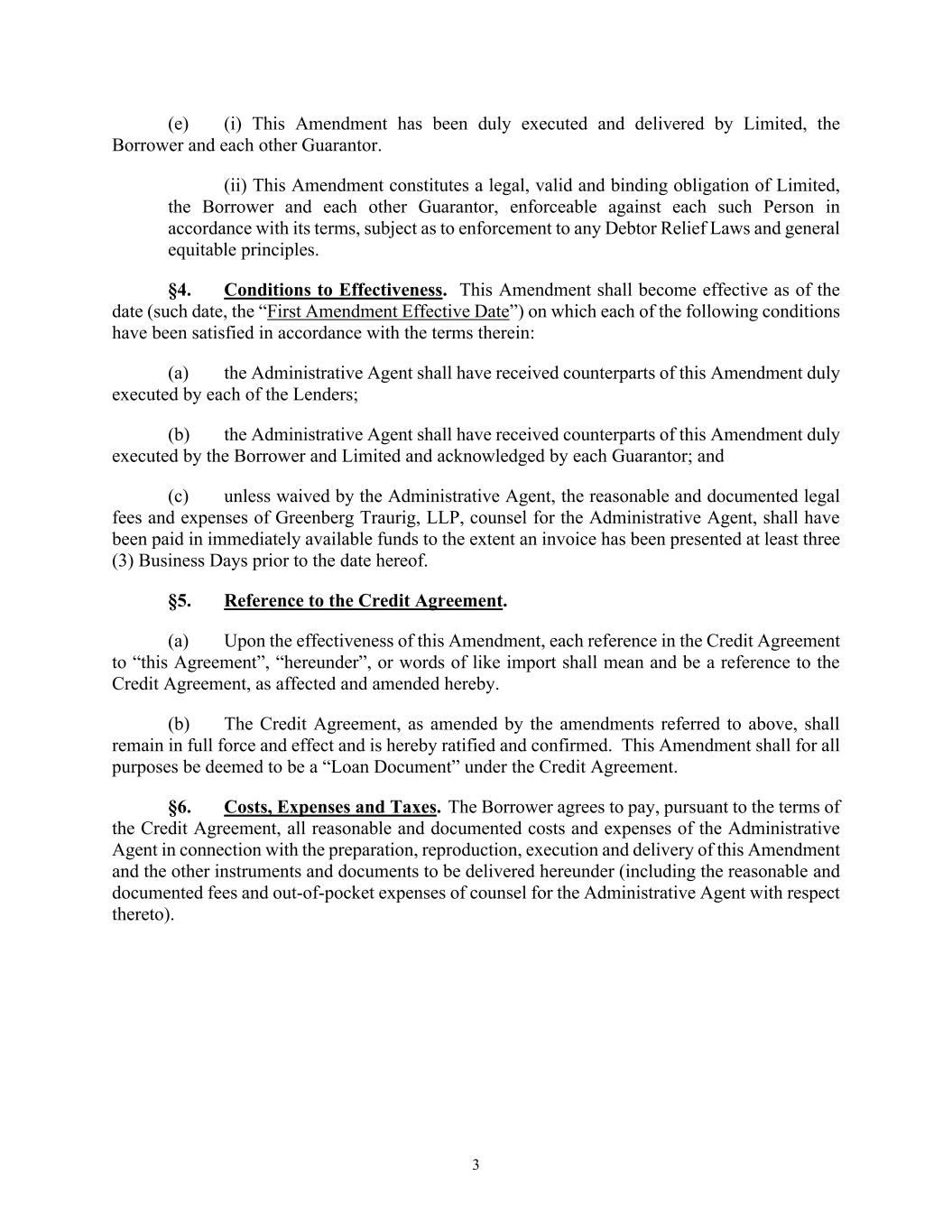3 (e) (i) This Amendment has been duly executed and delivered by Limited, the Borrower and each other Guarantor. (ii) This Amendment constitutes a legal, valid and binding obligation of Limited, the Borrower and each other Guarantor, enforceable against each such Person in accordance with its terms, subject as to enforcement to any Debtor Relief Laws and general equitable principles. §4. Conditions to Effectiveness. This Amendment shall become effective as of the date (such date, the “First Amendment Effective Date”) on which each of the following conditions have been satisfied in accordance with the terms therein: (a) the Administrative Agent shall have received counterparts of this Amendment duly executed by each of the Lenders; (b) the Administrative Agent shall have received counterparts of this Amendment duly executed by the Borrower and Limited and acknowledged by each Guarantor; and (c) unless waived by the Administrative Agent, the reasonable and documented legal fees and expenses of Greenberg Traurig, LLP, counsel for the Administrative Agent, shall have been paid in immediately available funds to the extent an invoice has been presented at least three (3) Business Days prior to the date hereof. §5. Reference to the Credit Agreement. (a) Upon the effectiveness of this Amendment, each reference in the Credit Agreement to “this Agreement”, “hereunder”, or words of like import shall mean and be a reference to the Credit Agreement, as affected and amended hereby. (b) The Credit Agreement, as amended by the amendments referred to above, shall remain in full force and effect and is hereby ratified and confirmed. This Amendment shall for all purposes be deemed to be a “Loan Document” under the Credit Agreement. §6. Costs, Expenses and Taxes. The Borrower agrees to pay, pursuant to the terms of the Credit Agreement, all reasonable and documented costs and expenses of the Administrative Agent in connection with the preparation, reproduction, execution and delivery of this Amendment and the other instruments and documents to be delivered hereunder (including the reasonable and documented fees and out-of-pocket expenses of counsel for the Administrative Agent with respect thereto).