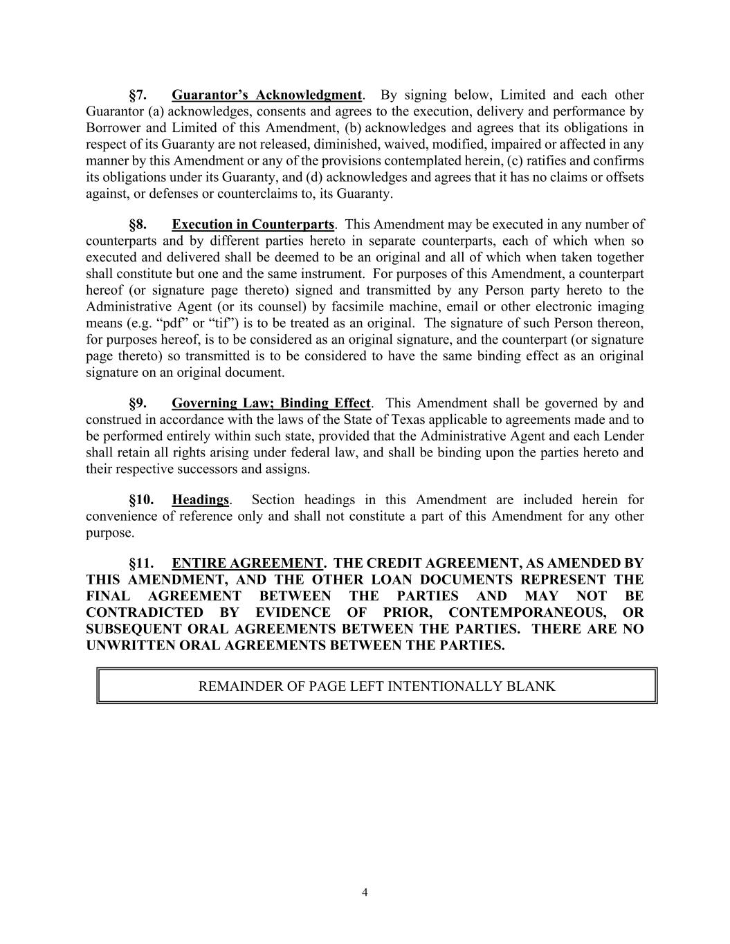 4 §7. Guarantor’s Acknowledgment. By signing below, Limited and each other Guarantor (a) acknowledges, consents and agrees to the execution, delivery and performance by Borrower and Limited of this Amendment, (b) acknowledges and agrees that its obligations in respect of its Guaranty are not released, diminished, waived, modified, impaired or affected in any manner by this Amendment or any of the provisions contemplated herein, (c) ratifies and confirms its obligations under its Guaranty, and (d) acknowledges and agrees that it has no claims or offsets against, or defenses or counterclaims to, its Guaranty. §8. Execution in Counterparts. This Amendment may be executed in any number of counterparts and by different parties hereto in separate counterparts, each of which when so executed and delivered shall be deemed to be an original and all of which when taken together shall constitute but one and the same instrument. For purposes of this Amendment, a counterpart hereof (or signature page thereto) signed and transmitted by any Person party hereto to the Administrative Agent (or its counsel) by facsimile machine, email or other electronic imaging means (e.g. “pdf” or “tif”) is to be treated as an original. The signature of such Person thereon, for purposes hereof, is to be considered as an original signature, and the counterpart (or signature page thereto) so transmitted is to be considered to have the same binding effect as an original signature on an original document. §9. Governing Law; Binding Effect. This Amendment shall be governed by and construed in accordance with the laws of the State of Texas applicable to agreements made and to be performed entirely within such state, provided that the Administrative Agent and each Lender shall retain all rights arising under federal law, and shall be binding upon the parties hereto and their respective successors and assigns. §10. Headings. Section headings in this Amendment are included herein for convenience of reference only and shall not constitute a part of this Amendment for any other purpose. §11. ENTIRE AGREEMENT. THE CREDIT AGREEMENT, AS AMENDED BY THIS AMENDMENT, AND THE OTHER LOAN DOCUMENTS REPRESENT THE FINAL AGREEMENT BETWEEN THE PARTIES AND MAY NOT BE CONTRADICTED BY EVIDENCE OF PRIOR, CONTEMPORANEOUS, OR SUBSEQUENT ORAL AGREEMENTS BETWEEN THE PARTIES. THERE ARE NO UNWRITTEN ORAL AGREEMENTS BETWEEN THE PARTIES. REMAINDER OF PAGE LEFT INTENTIONALLY BLANK