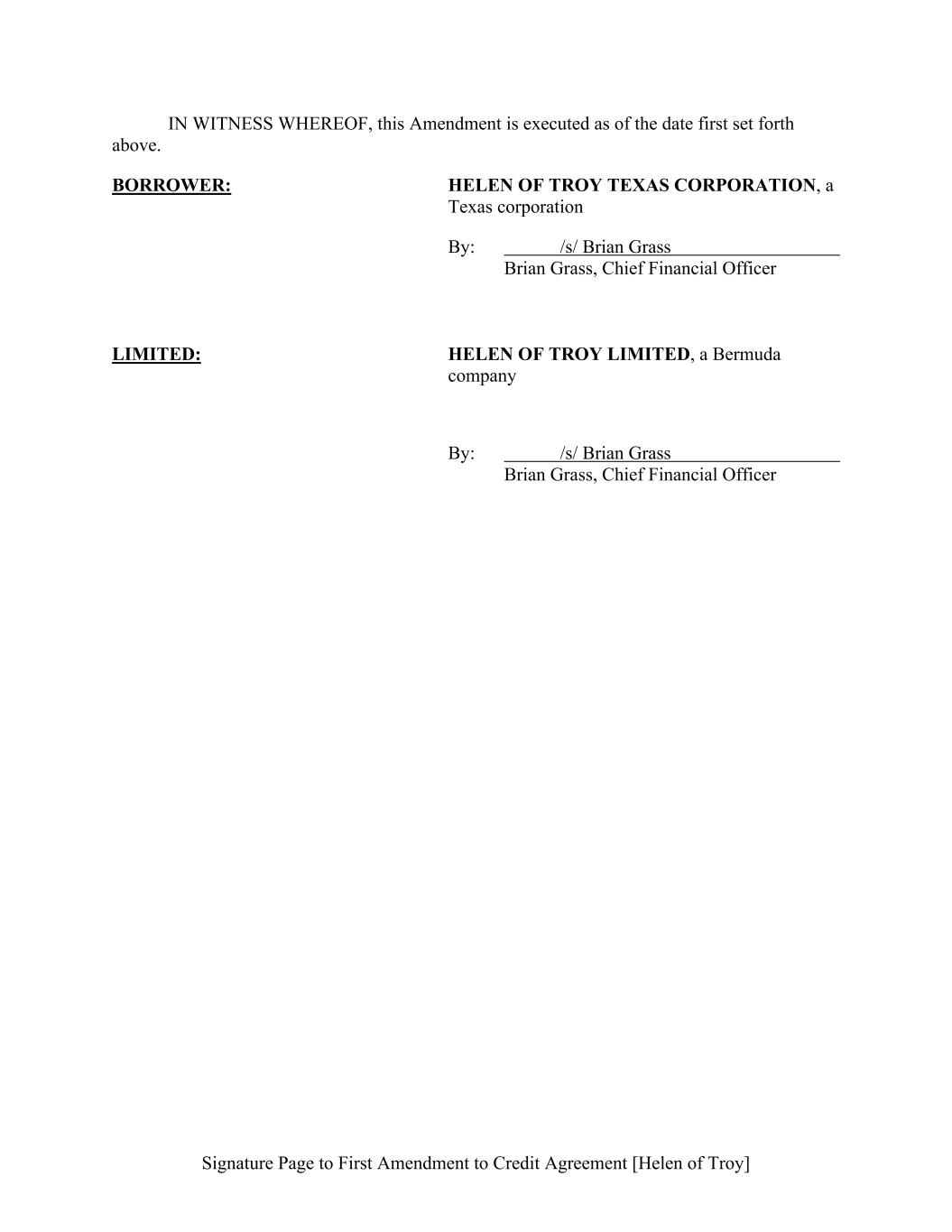 Signature Page to First Amendment to Credit Agreement [Helen of Troy] IN WITNESS WHEREOF, this Amendment is executed as of the date first set forth above. BORROWER: HELEN OF TROY TEXAS CORPORATION, a Texas corporation By: /s/ Brian Grass Brian Grass, Chief Financial Officer LIMITED: HELEN OF TROY LIMITED, a Bermuda company By: /s/ Brian Grass Brian Grass, Chief Financial Officer