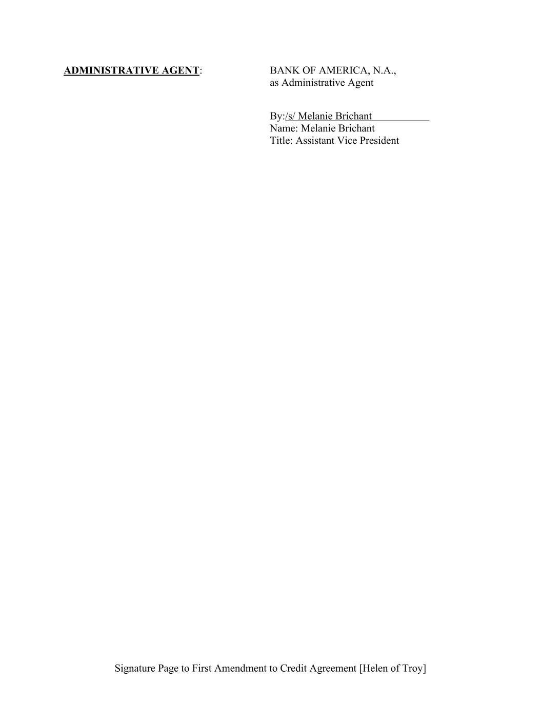 Signature Page to First Amendment to Credit Agreement [Helen of Troy] ADMINISTRATIVE AGENT: BANK OF AMERICA, N.A., as Administrative Agent By:/s/ Melanie Brichant Name: Melanie Brichant Title: Assistant Vice President