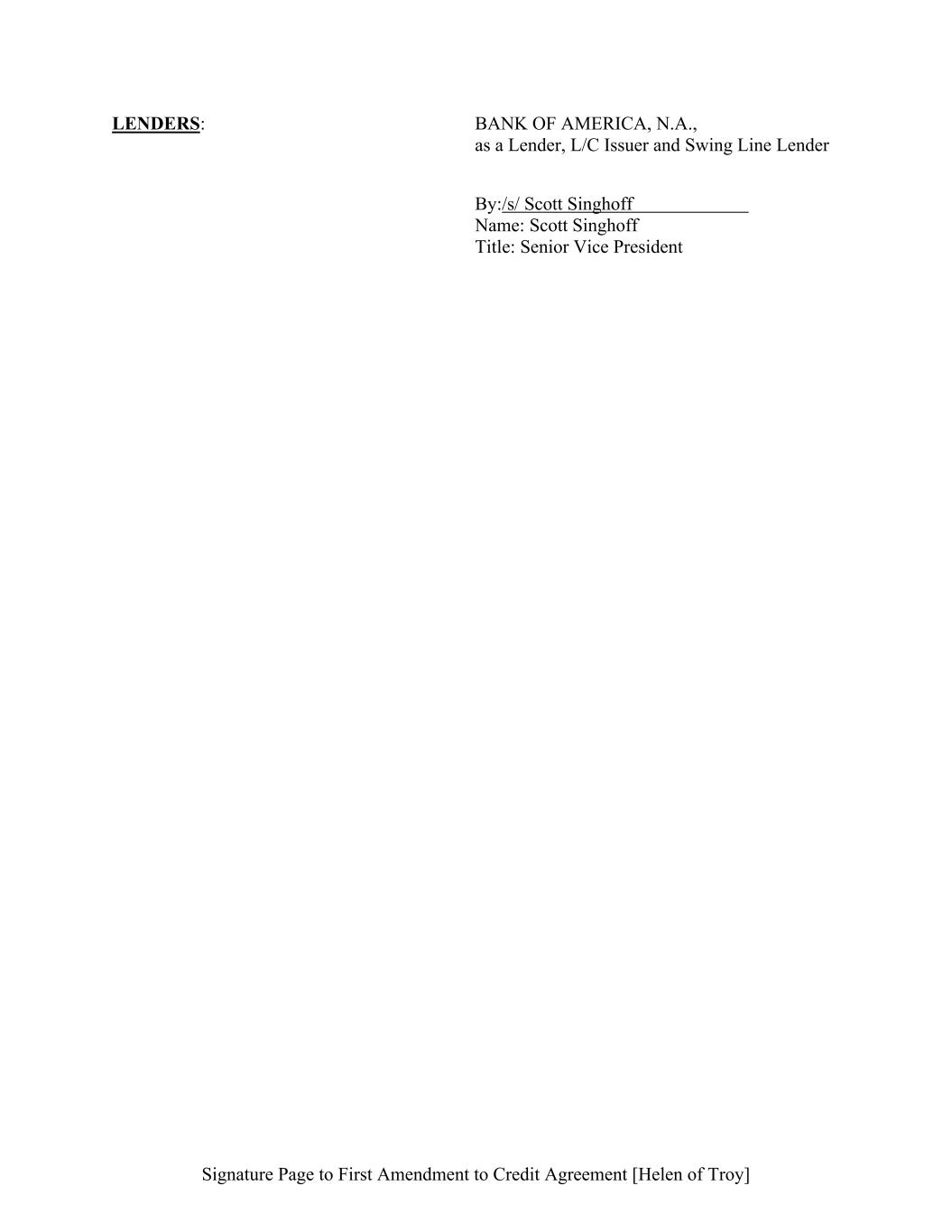 Signature Page to First Amendment to Credit Agreement [Helen of Troy] LENDERS: BANK OF AMERICA, N.A., as a Lender, L/C Issuer and Swing Line Lender By:/s/ Scott Singhoff Name: Scott Singhoff Title: Senior Vice President