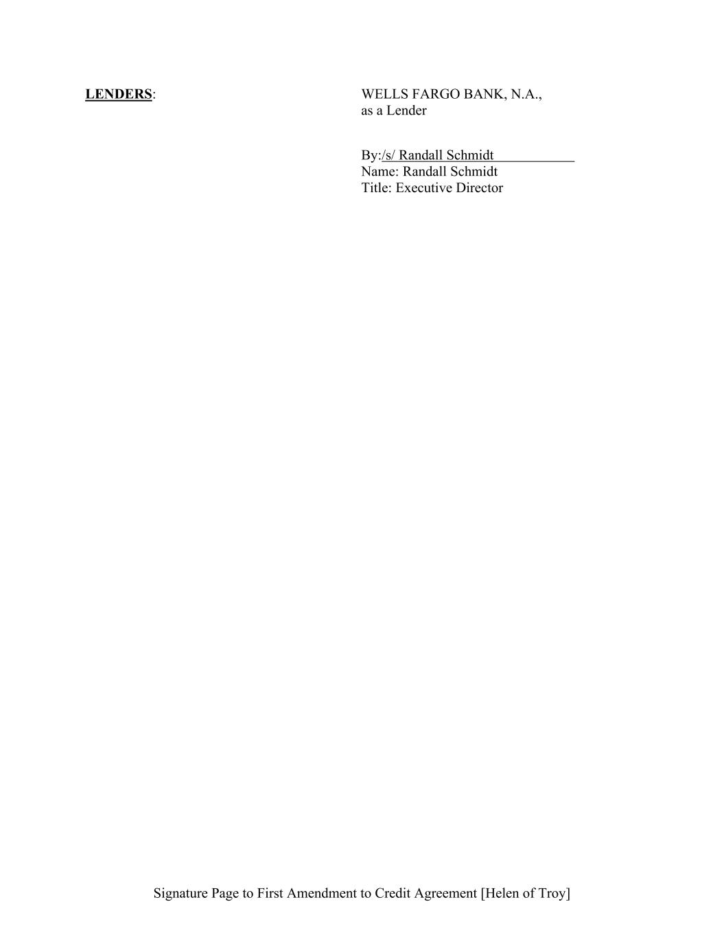 Signature Page to First Amendment to Credit Agreement [Helen of Troy] LENDERS: WELLS FARGO BANK, N.A., as a Lender By:/s/ Randall Schmidt Name: Randall Schmidt Title: Executive Director