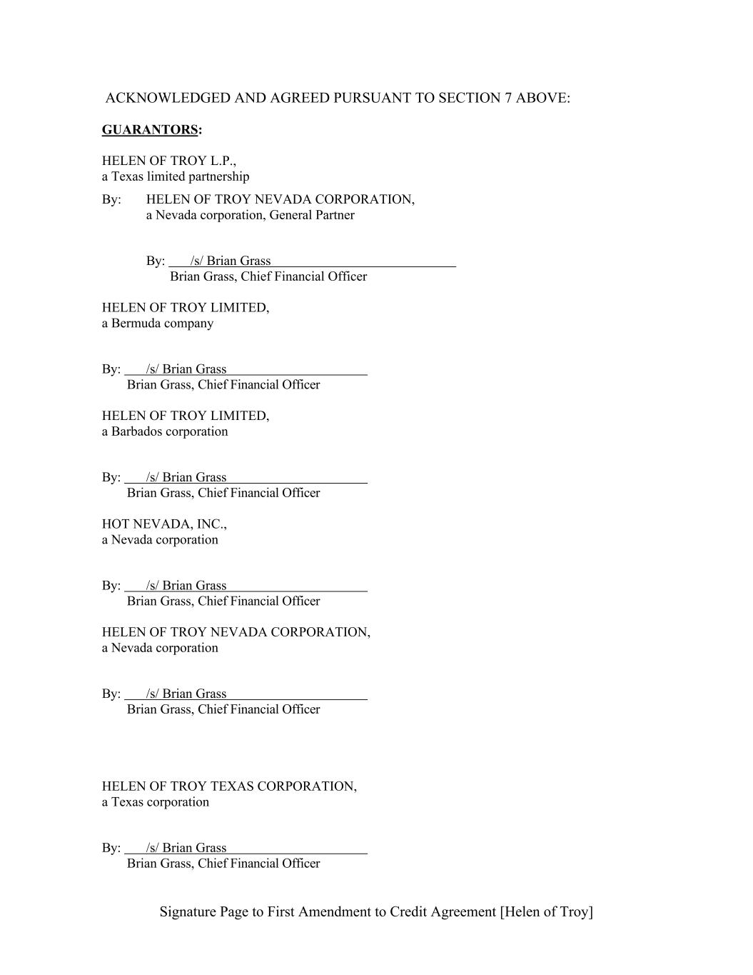 Signature Page to First Amendment to Credit Agreement [Helen of Troy] ACKNOWLEDGED AND AGREED PURSUANT TO SECTION 7 ABOVE: GUARANTORS: HELEN OF TROY L.P., a Texas limited partnership By: HELEN OF TROY NEVADA CORPORATION, a Nevada corporation, General Partner By: /s/ Brian Grass Brian Grass, Chief Financial Officer HELEN OF TROY LIMITED, a Bermuda company By: /s/ Brian Grass Brian Grass, Chief Financial Officer HELEN OF TROY LIMITED, a Barbados corporation By: /s/ Brian Grass Brian Grass, Chief Financial Officer HOT NEVADA, INC., a Nevada corporation By: /s/ Brian Grass Brian Grass, Chief Financial Officer HELEN OF TROY NEVADA CORPORATION, a Nevada corporation By: /s/ Brian Grass Brian Grass, Chief Financial Officer HELEN OF TROY TEXAS CORPORATION, a Texas corporation By: /s/ Brian Grass Brian Grass, Chief Financial Officer