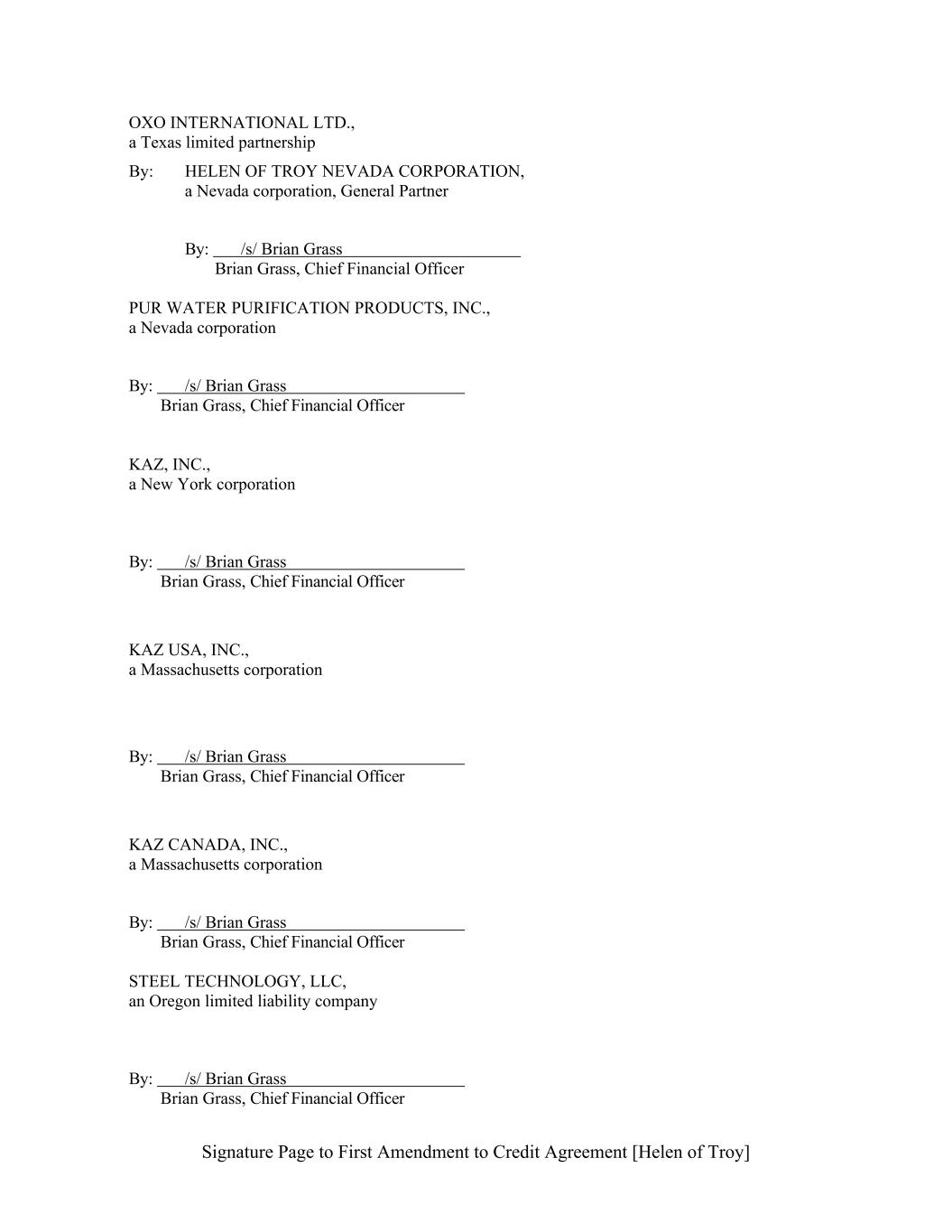 Signature Page to First Amendment to Credit Agreement [Helen of Troy] OXO INTERNATIONAL LTD., a Texas limited partnership By: HELEN OF TROY NEVADA CORPORATION, a Nevada corporation, General Partner By: /s/ Brian Grass Brian Grass, Chief Financial Officer PUR WATER PURIFICATION PRODUCTS, INC., a Nevada corporation By: /s/ Brian Grass Brian Grass, Chief Financial Officer KAZ, INC., a New York corporation By: /s/ Brian Grass Brian Grass, Chief Financial Officer KAZ USA, INC., a Massachusetts corporation By: /s/ Brian Grass Brian Grass, Chief Financial Officer KAZ CANADA, INC., a Massachusetts corporation By: /s/ Brian Grass Brian Grass, Chief Financial Officer STEEL TECHNOLOGY, LLC, an Oregon limited liability company By: /s/ Brian Grass Brian Grass, Chief Financial Officer