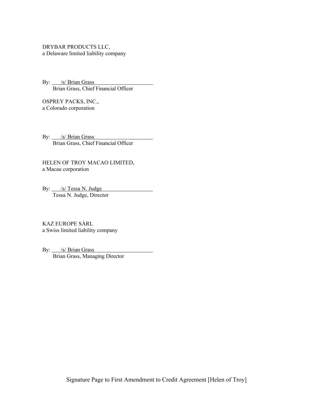 Signature Page to First Amendment to Credit Agreement [Helen of Troy] DRYBAR PRODUCTS LLC, a Delaware limited liability company By: /s/ Brian Grass Brian Grass, Chief Financial Officer OSPREY PACKS, INC., a Colorado corporation By: /s/ Brian Grass Brian Grass, Chief Financial Officer HELEN OF TROY MACAO LIMITED, a Macau corporation By: /s/ Tessa N. Judge Tessa N. Judge, Director KAZ EUROPE SÀRL a Swiss limited liability company By: /s/ Brian Grass Brian Grass, Managing Director