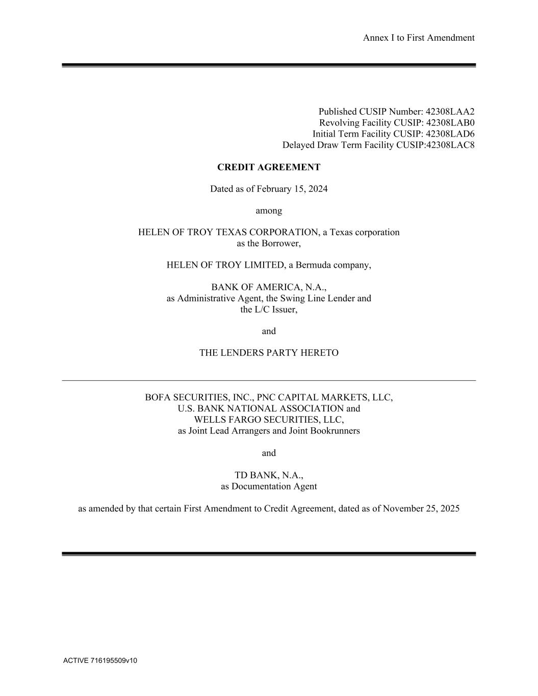 Annex I to First Amendment ACTIVE 716195509v10 Published CUSIP Number: 42308LAA2 Revolving Facility CUSIP: 42308LAB0 Initial Term Facility CUSIP: 42308LAD6 Delayed Draw Term Facility CUSIP:42308LAC8 CREDIT AGREEMENT Dated as of February 15, 2024 among HELEN OF TROY TEXAS CORPORATION, a Texas corporation as the Borrower, HELEN OF TROY LIMITED, a Bermuda company, BANK OF AMERICA, N.A., as Administrative Agent, the Swing Line Lender and the L/C Issuer, and THE LENDERS PARTY HERETO BOFA SECURITIES, INC., PNC CAPITAL MARKETS, LLC, U.S. BANK NATIONAL ASSOCIATION and WELLS FARGO SECURITIES, LLC, as Joint Lead Arrangers and Joint Bookrunners and TD BANK, N.A., as Documentation Agent as amended by that certain First Amendment to Credit Agreement, dated as of November 25, 2025