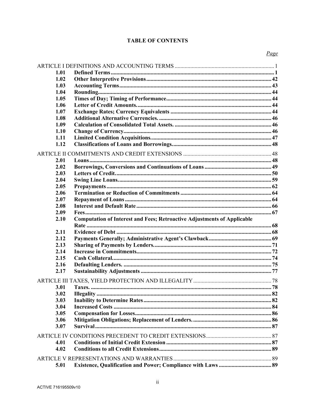 ii ACTIVE 716195509v10 TABLE OF CONTENTS Page ARTICLE I DEFINITIONS AND ACCOUNTING TERMS ...................................................................... 1 1.01 Defined Terms ................................................................................................................... 1 1.02 Other Interpretive Provisions ........................................................................................ 42 1.03 Accounting Terms ........................................................................................................... 43 1.04 Rounding.......................................................................................................................... 44 1.05 Times of Day; Timing of Performance .......................................................................... 44 1.06 Letter of Credit Amounts. .............................................................................................. 44 1.07 Exchange Rates; Currency Equivalents ....................................................................... 44 1.08 Additional Alternative Currencies. ............................................................................... 46 1.09 Calculation of Consolidated Total Assets. .................................................................... 46 1.10 Change of Currency. ....................................................................................................... 46 1.11 Limited Condition Acquisitions. .................................................................................... 47 1.12 Classifications of Loans and Borrowings. ..................................................................... 48 ARTICLE II COMMITMENTS AND CREDIT EXTENSIONS .............................................................. 48 2.01 Loans ................................................................................................................................ 48 2.02 Borrowings, Conversions and Continuations of Loans ............................................... 49 2.03 Letters of Credit. ............................................................................................................. 50 2.04 Swing Line Loans. ........................................................................................................... 59 2.05 Prepayments .................................................................................................................... 62 2.06 Termination or Reduction of Commitments ................................................................ 64 2.07 Repayment of Loans ....................................................................................................... 64 2.08 Interest and Default Rate ............................................................................................... 66 2.09 Fees ................................................................................................................................... 67 2.10 Computation of Interest and Fees; Retroactive Adjustments of Applicable Rate .................................................................................................................................. 68 2.11 Evidence of Debt ............................................................................................................. 68 2.12 Payments Generally; Administrative Agent’s Clawback ............................................ 69 2.13 Sharing of Payments by Lenders. .................................................................................. 71 2.14 Increase in Commitments............................................................................................... 72 2.15 Cash Collateral. ............................................................................................................... 74 2.16 Defaulting Lenders. ........................................................................................................ 75 2.17 Sustainability Adjustments ............................................................................................ 77 ARTICLE III TAXES, YIELD PROTECTION AND ILLEGALITY ....................................................... 78 3.01 Taxes. ............................................................................................................................... 78 3.02 Illegality ........................................................................................................................... 82 3.03 Inability to Determine Rates .......................................................................................... 82 3.04 Increased Costs ............................................................................................................... 84 3.05 Compensation for Losses ................................................................................................ 86 3.06 Mitigation Obligations; Replacement of Lenders. ....................................................... 86 3.07 Survival ............................................................................................................................ 87 ARTICLE IV CONDITIONS PRECEDENT TO CREDIT EXTENSIONS .............................................. 87 4.01 Conditions of Initial Credit Extension .......................................................................... 87 4.02 Conditions to all Credit Extensions ............................................................................... 89 ARTICLE V REPRESENTATIONS AND WARRANTIES ..................................................................... 89 5.01 Existence, Qualification and Power; Compliance with Laws ..................................... 89