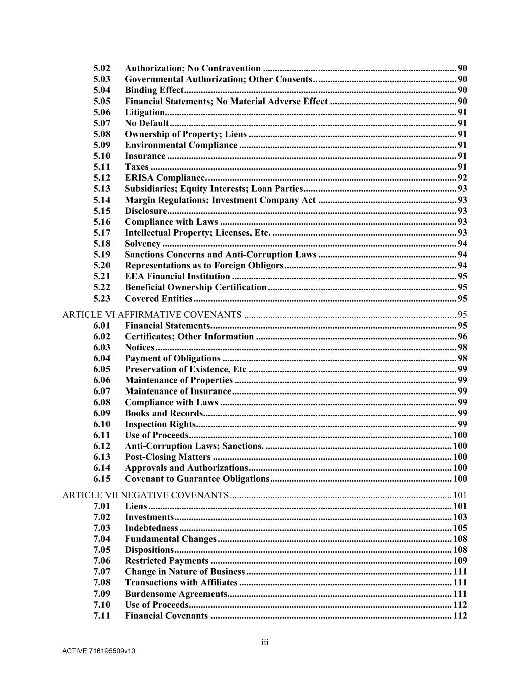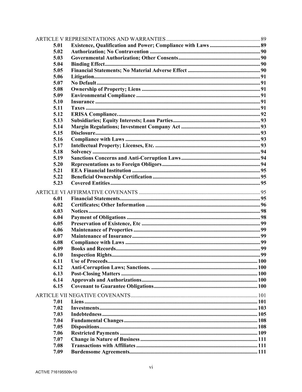 vi ACTIVE 716195509v10 ARTICLE V REPRESENTATIONS AND WARRANTIES ..................................................................... 89 5.01 Existence, Qualification and Power; Compliance with Laws ..................................... 89 5.02 Authorization; No Contravention ................................................................................. 90 5.03 Governmental Authorization; Other Consents ............................................................ 90 5.04 Binding Effect .................................................................................................................. 90 5.05 Financial Statements; No Material Adverse Effect ..................................................... 90 5.06 Litigation.......................................................................................................................... 91 5.07 No Default ........................................................................................................................ 91 5.08 Ownership of Property; Liens ....................................................................................... 91 5.09 Environmental Compliance ........................................................................................... 91 5.10 Insurance ......................................................................................................................... 91 5.11 Taxes ................................................................................................................................ 91 5.12 ERISA Compliance. ........................................................................................................ 92 5.13 Subsidiaries; Equity Interests; Loan Parties ................................................................ 93 5.14 Margin Regulations; Investment Company Act .......................................................... 93 5.15 Disclosure ......................................................................................................................... 93 5.16 Compliance with Laws ................................................................................................... 93 5.17 Intellectual Property; Licenses, Etc. ............................................................................. 93 5.18 Solvency ........................................................................................................................... 94 5.19 Sanctions Concerns and Anti-Corruption Laws .......................................................... 94 5.20 Representations as to Foreign Obligors ........................................................................ 94 5.21 EEA Financial Institution .............................................................................................. 95 5.22 Beneficial Ownership Certification ............................................................................... 95 5.23 Covered Entities .............................................................................................................. 95 ARTICLE VI AFFIRMATIVE COVENANTS ......................................................................................... 95 6.01 Financial Statements. ...................................................................................................... 95 6.02 Certificates; Other Information .................................................................................... 96 6.03 Notices .............................................................................................................................. 98 6.04 Payment of Obligations .................................................................................................. 98 6.05 Preservation of Existence, Etc ....................................................................................... 99 6.06 Maintenance of Properties ............................................................................................. 99 6.07 Maintenance of Insurance .............................................................................................. 99 6.08 Compliance with Laws ................................................................................................... 99 6.09 Books and Records .......................................................................................................... 99 6.10 Inspection Rights ............................................................................................................. 99 6.11 Use of Proceeds .............................................................................................................. 100 6.12 Anti-Corruption Laws; Sanctions. .............................................................................. 100 6.13 Post-Closing Matters .................................................................................................... 100 6.14 Approvals and Authorizations ..................................................................................... 100 6.15 Covenant to Guarantee Obligations ............................................................................ 100 ARTICLE VII NEGATIVE COVENANTS ............................................................................................. 101 7.01 Liens ............................................................................................................................... 101 7.02 Investments .................................................................................................................... 103 7.03 Indebtedness .................................................................................................................. 105 7.04 Fundamental Changes .................................................................................................. 108 7.05 Dispositions .................................................................................................................... 108 7.06 Restricted Payments .........................................