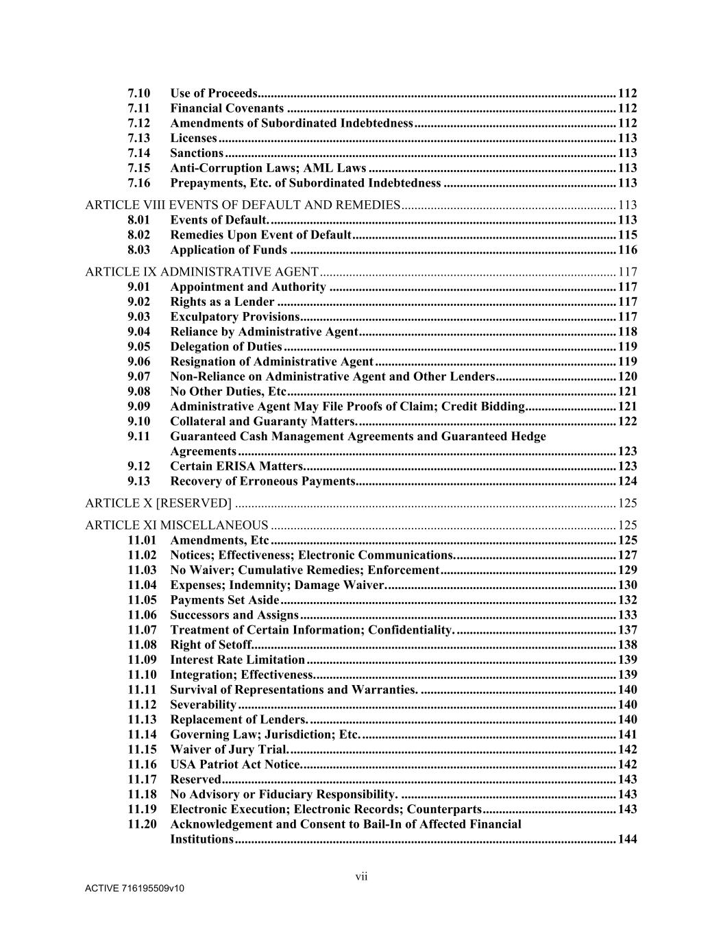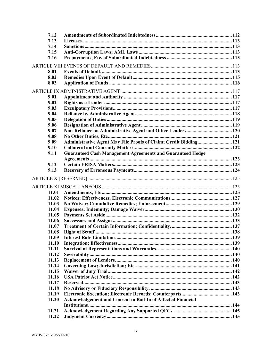 vii ACTIVE 716195509v10 7.10 Use of Proceeds .............................................................................................................. 112 7.11 Financial Covenants ..................................................................................................... 112 7.12 Amendments of Subordinated Indebtedness .............................................................. 112 7.13 Licenses .......................................................................................................................... 113 7.14 Sanctions ........................................................................................................................ 113 7.15 Anti-Corruption Laws; AML Laws ............................................................................ 113 7.16 Prepayments, Etc. of Subordinated Indebtedness ..................................................... 113 ARTICLE VIII EVENTS OF DEFAULT AND REMEDIES .................................................................. 113 8.01 Events of Default. .......................................................................................................... 113 8.02 Remedies Upon Event of Default ................................................................................. 115 8.03 Application of Funds .................................................................................................... 116 ARTICLE IX ADMINISTRATIVE AGENT ........................................................................................... 117 9.01 Appointment and Authority ........................................................................................ 117 9.02 Rights as a Lender ........................................................................................................ 117 9.03 Exculpatory Provisions ................................................................................................. 117 9.04 Reliance by Administrative Agent ............................................................................... 118 9.05 Delegation of Duties ...................................................................................................... 119 9.06 Resignation of Administrative Agent .......................................................................... 119 9.07 Non-Reliance on Administrative Agent and Other Lenders ..................................... 120 9.08 No Other Duties, Etc ..................................................................................................... 121 9.09 Administrative Agent May File Proofs of Claim; Credit Bidding ............................ 121 9.10 Collateral and Guaranty Matters. ............................................................................... 122 9.11 Guaranteed Cash Management Agreements and Guaranteed Hedge Agreements .................................................................................................................... 123 9.12 Certain ERISA Matters. ............................................................................................... 123 9.13 Recovery of Erroneous Payments ................................................................................ 124 ARTICLE X [RESERVED] ..................................................................................................................... 125 ARTICLE XI MISCELLANEOUS .......................................................................................................... 125 11.01 Amendments, Etc .......................................................................................................... 125 11.02 Notices; Effectiveness; Electronic Communications. ................................................. 127 11.03 No Waiver; Cumulative Remedies; Enforcement ...................................................... 129 11.04 Expenses; Indemnity; Damage Waiver. ...................................................................... 130 11.05 Payments Set Aside ....................................................................................................... 132 11.06 Successors and Assigns ................................................................................................. 133 11.07 Treatment of Certain Information; Confidentiality. ................................................. 137 11.08 Right of Setoff. ............................................................................................................... 138 11.09 Interest Rate Limitation ............................................................................................... 139 11.10 Integration; Effectiveness. ............................................................................................ 139 11.11 Survival of Representations and Warranties. ............................................................ 140 11.12 Severability .................................................................................................................... 140 11.13 Replacement of Lenders. .............................................................................................. 140 11.14 Governing Law; Jurisdiction; Etc. .............................................................................. 141 11.15 Waiver of Jury Trial. .................................................................................................... 142 11.16 USA Patriot Act Notice. ................................................................................................ 142 11.17 Reserved ......................................................................................................................... 143 11.18 No Advisory or Fiduciary Responsibility. .................................................................. 143 11.19 Electronic Execution; Electronic Records; Counterparts ......................................... 143 11.20 Acknowledgement and Consent to Bail-In of Affected Financial Institutions .....................................................