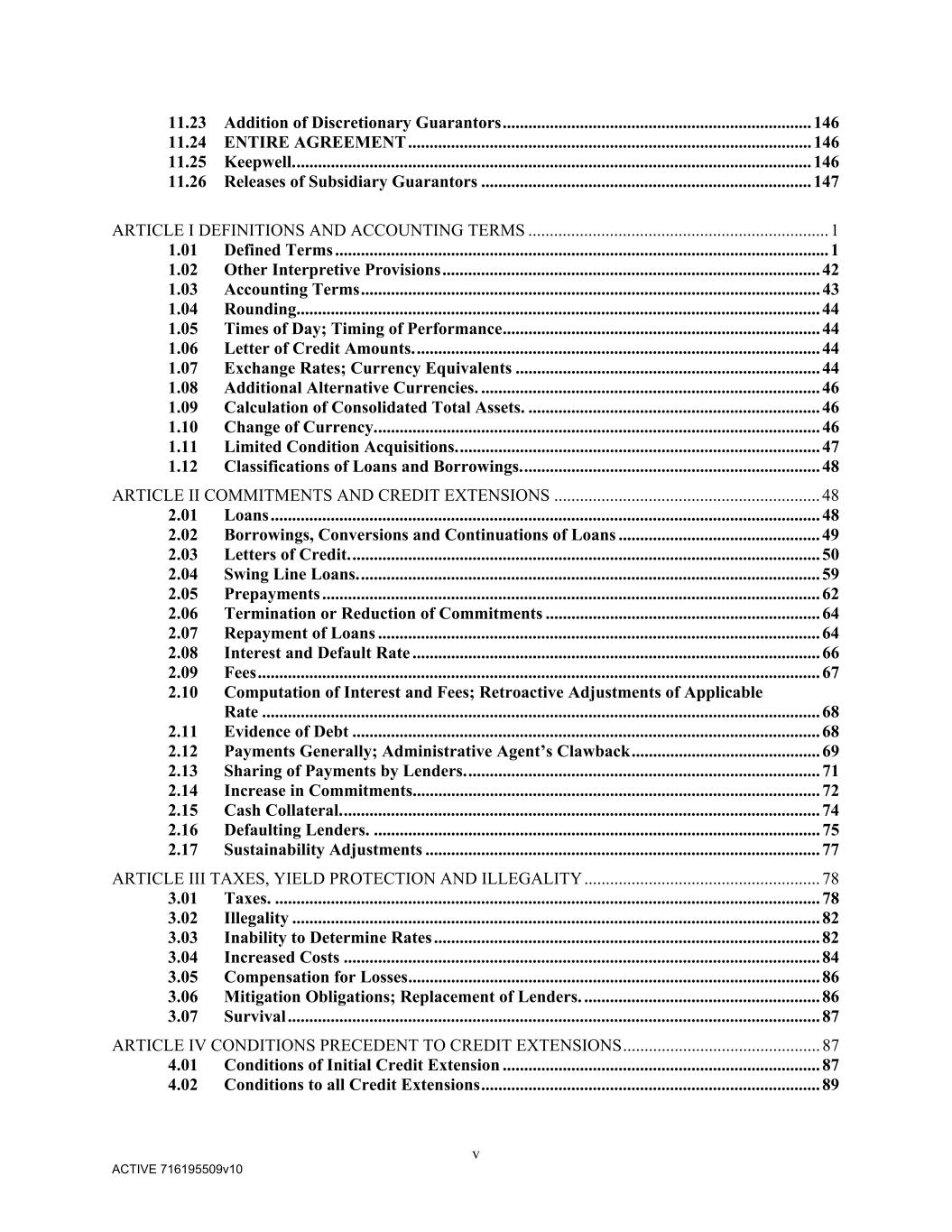 v ACTIVE 716195509v10 11.23 Addition of Discretionary Guarantors ........................................................................ 146 11.24 ENTIRE AGREEMENT .............................................................................................. 146 11.25 Keepwell. ........................................................................................................................ 146 11.26 Releases of Subsidiary Guarantors ............................................................................. 147 ARTICLE I DEFINITIONS AND ACCOUNTING TERMS ...................................................................... 1 1.01 Defined Terms ................................................................................................................... 1 1.02 Other Interpretive Provisions ........................................................................................ 42 1.03 Accounting Terms ........................................................................................................... 43 1.04 Rounding.......................................................................................................................... 44 1.05 Times of Day; Timing of Performance .......................................................................... 44 1.06 Letter of Credit Amounts. .............................................................................................. 44 1.07 Exchange Rates; Currency Equivalents ....................................................................... 44 1.08 Additional Alternative Currencies. ............................................................................... 46 1.09 Calculation of Consolidated Total Assets. .................................................................... 46 1.10 Change of Currency. ....................................................................................................... 46 1.11 Limited Condition Acquisitions. .................................................................................... 47 1.12 Classifications of Loans and Borrowings. ..................................................................... 48 ARTICLE II COMMITMENTS AND CREDIT EXTENSIONS .............................................................. 48 2.01 Loans ................................................................................................................................ 48 2.02 Borrowings, Conversions and Continuations of Loans ............................................... 49 2.03 Letters of Credit. ............................................................................................................. 50 2.04 Swing Line Loans. ........................................................................................................... 59 2.05 Prepayments .................................................................................................................... 62 2.06 Termination or Reduction of Commitments ................................................................ 64 2.07 Repayment of Loans ....................................................................................................... 64 2.08 Interest and Default Rate ............................................................................................... 66 2.09 Fees ................................................................................................................................... 67 2.10 Computation of Interest and Fees; Retroactive Adjustments of Applicable Rate .................................................................................................................................. 68 2.11 Evidence of Debt ............................................................................................................. 68 2.12 Payments Generally; Administrative Agent’s Clawback ............................................ 69 2.13 Sharing of Payments by Lenders. .................................................................................. 71 2.14 Increase in Commitments............................................................................................... 72 2.15 Cash Collateral. ............................................................................................................... 74 2.16 Defaulting Lenders. ........................................................................................................ 75 2.17 Sustainability Adjustments ............................................................................................ 77 ARTICLE III TAXES, YIELD PROTECTION AND ILLEGALITY ....................................................... 78 3.01 Taxes. ............................................................................................................................... 78 3.02 Illegality ........................................................................................................................... 82 3.03 Inability to Determine Rates .......................................................................................... 82 3.04 Increased Costs ............................................................................................................... 84 3.05 Compensation for Losses ................................................................................................ 86 3.06 Mitigation Obligations; Replacement of Lenders. ....................................................... 86 3.07 Survival ............................................................................................................................ 87 ARTICLE IV CONDITIONS PRECEDENT TO CREDIT EXTENSIONS .............................................. 87 4.01 Conditions of Initial Credit Extension .......................................................................... 87 4.02 Conditions to all Credit Extensions ............................................................................... 89