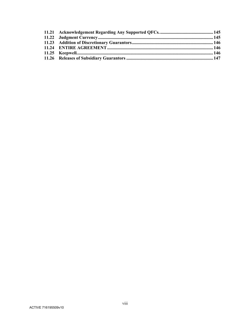 viii ACTIVE 716195509v10 11.21 Acknowledgement Regarding Any Supported QFCs. ............................................... 145 11.22 Judgment Currency ...................................................................................................... 145 11.23 Addition of Discretionary Guarantors ........................................................................ 146 11.24 ENTIRE AGREEMENT .............................................................................................. 146 11.25 Keepwell. ........................................................................................................................ 146 11.26 Releases of Subsidiary Guarantors ............................................................................. 147