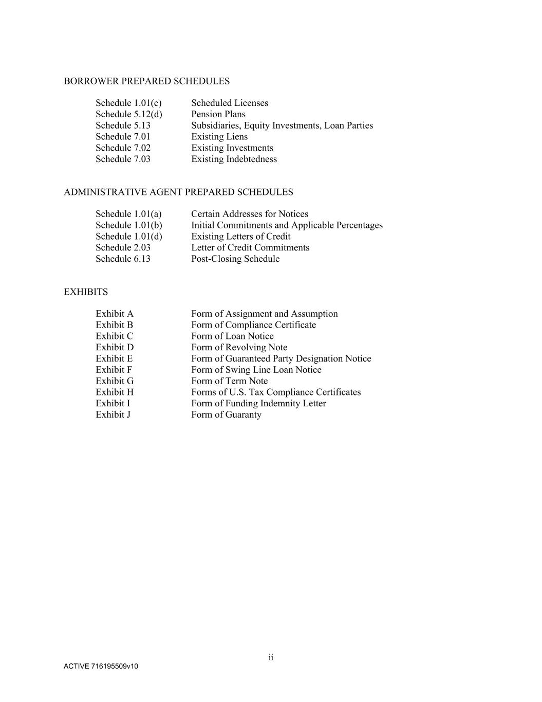 ii ACTIVE 716195509v10 BORROWER PREPARED SCHEDULES Schedule 1.01(c) Scheduled Licenses Schedule 5.12(d) Pension Plans Schedule 5.13 Subsidiaries, Equity Investments, Loan Parties Schedule 7.01 Existing Liens Schedule 7.02 Existing Investments Schedule 7.03 Existing Indebtedness ADMINISTRATIVE AGENT PREPARED SCHEDULES Schedule 1.01(a) Certain Addresses for Notices Schedule 1.01(b) Initial Commitments and Applicable Percentages Schedule 1.01(d) Existing Letters of Credit Schedule 2.03 Letter of Credit Commitments Schedule 6.13 Post-Closing Schedule EXHIBITS Exhibit A Form of Assignment and Assumption Exhibit B Form of Compliance Certificate Exhibit C Form of Loan Notice Exhibit D Form of Revolving Note Exhibit E Form of Guaranteed Party Designation Notice Exhibit F Form of Swing Line Loan Notice Exhibit G Form of Term Note Exhibit H Forms of U.S. Tax Compliance Certificates Exhibit I Form of Funding Indemnity Letter Exhibit J Form of Guaranty