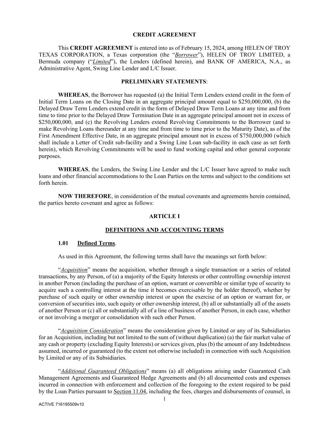 1 ACTIVE 716195509v10 CREDIT AGREEMENT This CREDIT AGREEMENT is entered into as of February 15, 2024, among HELEN OF TROY TEXAS CORPORATION, a Texas corporation (the “Borrower”), HELEN OF TROY LIMITED, a Bermuda company (“Limited”), the Lenders (defined herein), and BANK OF AMERICA, N.A., as Administrative Agent, Swing Line Lender and L/C Issuer. PRELIMINARY STATEMENTS: WHEREAS, the Borrower has requested (a) the Initial Term Lenders extend credit in the form of Initial Term Loans on the Closing Date in an aggregate principal amount equal to $250,000,000, (b) the Delayed Draw Term Lenders extend credit in the form of Delayed Draw Term Loans at any time and from time to time prior to the Delayed Draw Termination Date in an aggregate principal amount not in excess of $250,000,000, and (c) the Revolving Lenders extend Revolving Commitments to the Borrower (and to make Revolving Loans thereunder at any time and from time to time prior to the Maturity Date), as of the First Amendment Effective Date, in an aggregate principal amount not in excess of $750,000,000 (which shall include a Letter of Credit sub-facility and a Swing Line Loan sub-facility in each case as set forth herein), which Revolving Commitments will be used to fund working capital and other general corporate purposes. WHEREAS, the Lenders, the Swing Line Lender and the L/C Issuer have agreed to make such loans and other financial accommodations to the Loan Parties on the terms and subject to the conditions set forth herein. NOW THEREFORE, in consideration of the mutual covenants and agreements herein contained, the parties hereto covenant and agree as follows: ARTICLE I DEFINITIONS AND ACCOUNTING TERMS 1.01 Defined Terms. As used in this Agreement, the following terms shall have the meanings set forth below: “Acquisition” means the acquisition, whether through a single transaction or a series of related transactions, by any Person, of (a) a majority of the Equity Interests or other controlling ownership interest in another Person (including the purchase of an option, warrant or convertible or similar type of security to acquire such a controlling interest at the time it becomes exercisable by the holder thereof), whether by purchase of such equity or other ownership interest or upon the exercise of an option or warrant for, or conversion of securities into, such equity or other ownership interest, (b) all or substantially all of the assets of another Person or (c) all or substantially all of a line of business of another Person, in each case, whether or not involving a merger or consolidation with such other Person. “Acquisition Consideration” means the consideration given by Limited or any of its Subsidiaries for an Acquisition, including but not limited to the sum of (without duplication) (a) the fair market value of any cash or property (excluding Equity Interests) or services given, plus (b) the amount of any Indebtedness assumed, incurred or guaranteed (to the extent not otherwise included) in connection with such Acquisition by Limited or any of its Subsidiaries. “Additional Guaranteed Obligations” means (a) all obligations arising under Guaranteed Cash Management Agreements and Guaranteed Hedge Agreements and (b) all documented costs and expenses incurred in connection with enforcement and collection of the foregoing to the extent required to be paid by the Loan Parties pursuant to Section 11.04, including the fees, charges and disbursements of counsel, in