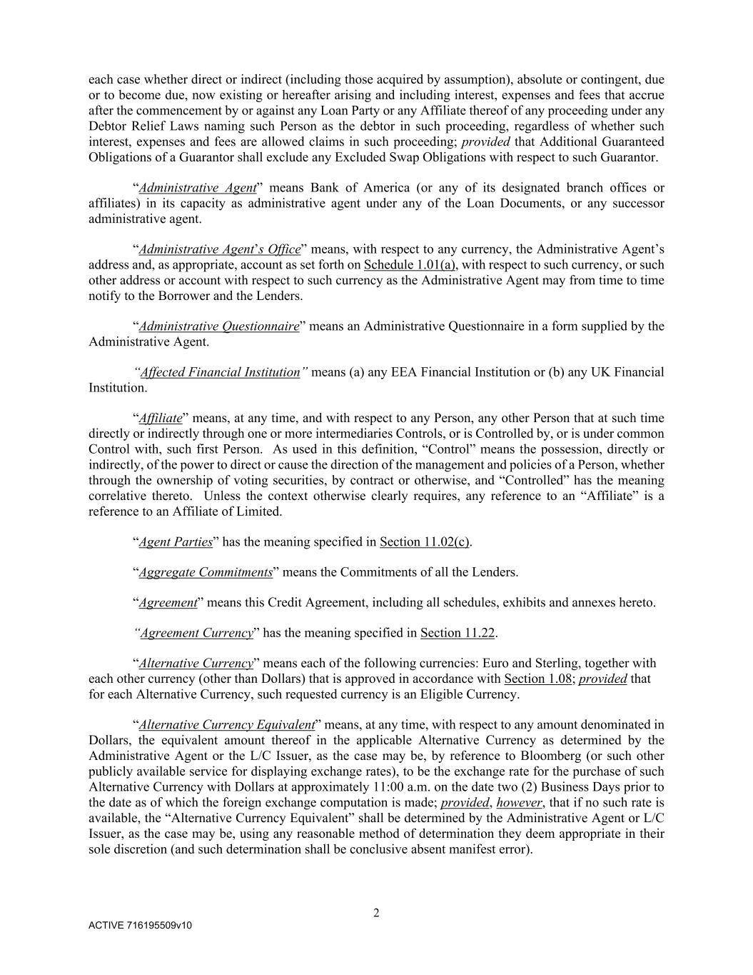 2 ACTIVE 716195509v10 each case whether direct or indirect (including those acquired by assumption), absolute or contingent, due or to become due, now existing or hereafter arising and including interest, expenses and fees that accrue after the commencement by or against any Loan Party or any Affiliate thereof of any proceeding under any Debtor Relief Laws naming such Person as the debtor in such proceeding, regardless of whether such interest, expenses and fees are allowed claims in such proceeding; provided that Additional Guaranteed Obligations of a Guarantor shall exclude any Excluded Swap Obligations with respect to such Guarantor. “Administrative Agent” means Bank of America (or any of its designated branch offices or affiliates) in its capacity as administrative agent under any of the Loan Documents, or any successor administrative agent. “Administrative Agent’s Office” means, with respect to any currency, the Administrative Agent’s address and, as appropriate, account as set forth on Schedule 1.01(a), with respect to such currency, or such other address or account with respect to such currency as the Administrative Agent may from time to time notify to the Borrower and the Lenders. “Administrative Questionnaire” means an Administrative Questionnaire in a form supplied by the Administrative Agent. “Affected Financial Institution” means (a) any EEA Financial Institution or (b) any UK Financial Institution. “Affiliate” means, at any time, and with respect to any Person, any other Person that at such time directly or indirectly through one or more intermediaries Controls, or is Controlled by, or is under common Control with, such first Person. As used in this definition, “Control” means the possession, directly or indirectly, of the power to direct or cause the direction of the management and policies of a Person, whether through the ownership of voting securities, by contract or otherwise, and “Controlled” has the meaning correlative thereto. Unless the context otherwise clearly requires, any reference to an “Affiliate” is a reference to an Affiliate of Limited. “Agent Parties” has the meaning specified in Section 11.02(c). “Aggregate Commitments” means the Commitments of all the Lenders. “Agreement” means this Credit Agreement, including all schedules, exhibits and annexes hereto. “Agreement Currency” has the meaning specified in Section 11.22. “Alternative Currency” means each of the following currencies: Euro and Sterling, together with each other currency (other than Dollars) that is approved in accordance with Section 1.08; provided that for each Alternative Currency, such requested currency is an Eligible Currency. “Alternative Currency Equivalent” means, at any time, with respect to any amount denominated in Dollars, the equivalent amount thereof in the applicable Alternative Currency as determined by the Administrative Agent or the L/C Issuer, as the case may be, by reference to Bloomberg (or such other publicly available service for displaying exchange rates), to be the exchange rate for the purchase of such Alternative Currency with Dollars at approximately 11:00 a.m. on the date two (2) Business Days prior to the date as of which the foreign exchange computation is made; provided, however, that if no such rate is available, the “Alternative Currency Equivalent” shall be determined by the Administrative Agent or L/C Issuer, as the case may be, using any reasonable method of determination they deem appropriate in their sole discretion (and such determination shall be conclusive absent manifest error).