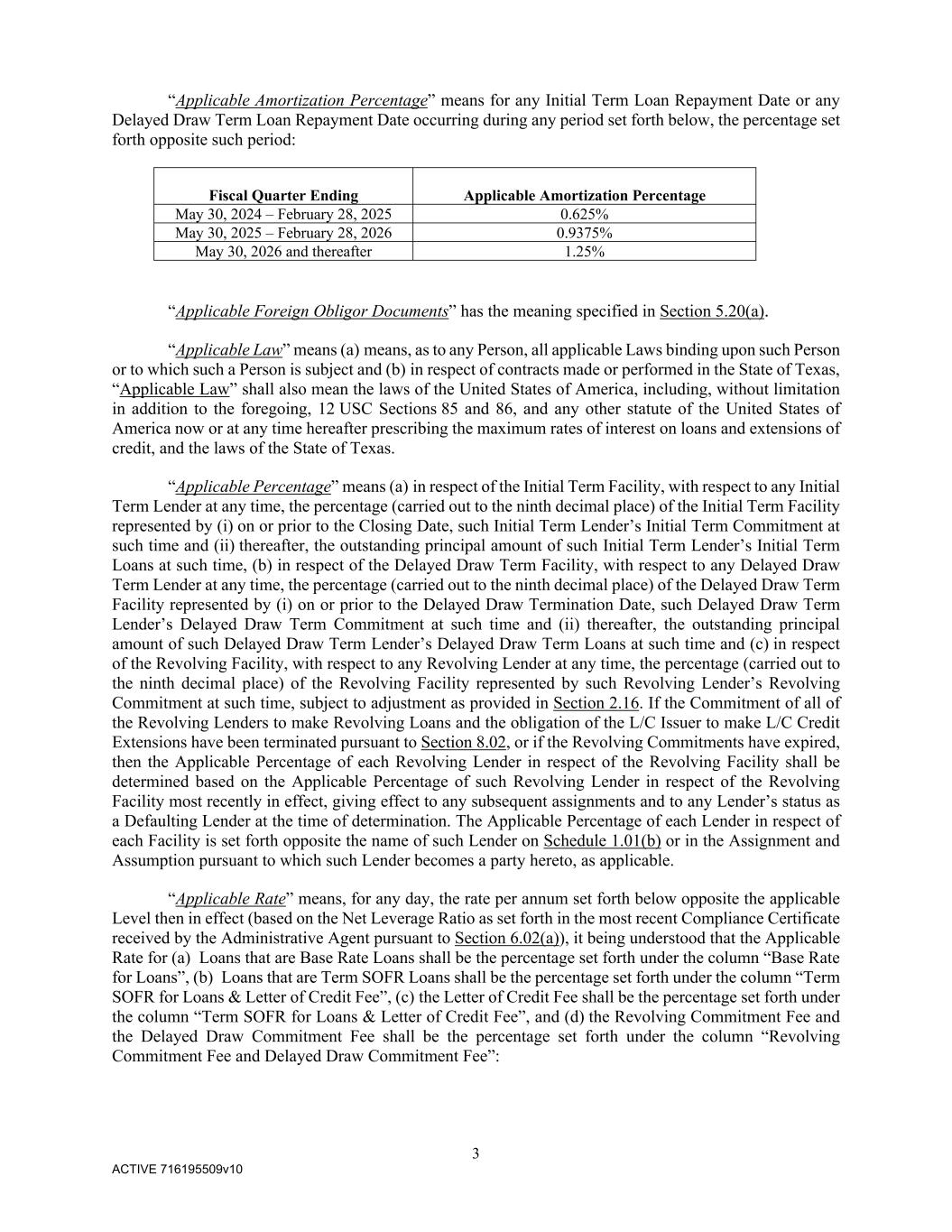 3 ACTIVE 716195509v10 “Applicable Amortization Percentage” means for any Initial Term Loan Repayment Date or any Delayed Draw Term Loan Repayment Date occurring during any period set forth below, the percentage set forth opposite such period: Fiscal Quarter Ending Applicable Amortization Percentage May 30, 2024 – February 28, 2025 0.625% May 30, 2025 – February 28, 2026 0.9375% May 30, 2026 and thereafter 1.25% “Applicable Foreign Obligor Documents” has the meaning specified in Section 5.20(a). “Applicable Law” means (a) means, as to any Person, all applicable Laws binding upon such Person or to which such a Person is subject and (b) in respect of contracts made or performed in the State of Texas, “Applicable Law” shall also mean the laws of the United States of America, including, without limitation in addition to the foregoing, 12 USC Sections 85 and 86, and any other statute of the United States of America now or at any time hereafter prescribing the maximum rates of interest on loans and extensions of credit, and the laws of the State of Texas. “Applicable Percentage” means (a) in respect of the Initial Term Facility, with respect to any Initial Term Lender at any time, the percentage (carried out to the ninth decimal place) of the Initial Term Facility represented by (i) on or prior to the Closing Date, such Initial Term Lender’s Initial Term Commitment at such time and (ii) thereafter, the outstanding principal amount of such Initial Term Lender’s Initial Term Loans at such time, (b) in respect of the Delayed Draw Term Facility, with respect to any Delayed Draw Term Lender at any time, the percentage (carried out to the ninth decimal place) of the Delayed Draw Term Facility represented by (i) on or prior to the Delayed Draw Termination Date, such Delayed Draw Term Lender’s Delayed Draw Term Commitment at such time and (ii) thereafter, the outstanding principal amount of such Delayed Draw Term Lender’s Delayed Draw Term Loans at such time and (c) in respect of the Revolving Facility, with respect to any Revolving Lender at any time, the percentage (carried out to the ninth decimal place) of the Revolving Facility represented by such Revolving Lender’s Revolving Commitment at such time, subject to adjustment as provided in Section 2.16. If the Commitment of all of the Revolving Lenders to make Revolving Loans and the obligation of the L/C Issuer to make L/C Credit Extensions have been terminated pursuant to Section 8.02, or if the Revolving Commitments have expired, then the Applicable Percentage of each Revolving Lender in respect of the Revolving Facility shall be determined based on the Applicable Percentage of such Revolving Lender in respect of the Revolving Facility most recently in effect, giving effect to any subsequent assignments and to any Lender’s status as a Defaulting Lender at the time of determination. The Applicable Percentage of each Lender in respect of each Facility is set forth opposite the name of such Lender on Schedule 1.01(b) or in the Assignment and Assumption pursuant to which such Lender becomes a party hereto, as applicable. “Applicable Rate” means, for any day, the rate per annum set forth below opposite the applicable Level then in effect (based on the Net Leverage Ratio as set forth in the most recent Compliance Certificate received by the Administrative Agent pursuant to Section 6.02(a)), it being understood that the Applicable Rate for (a) Loans that are Base Rate Loans shall be the percentage set forth under the column “Base Rate for Loans”, (b) Loans that are Term SOFR Loans shall be the percentage set forth under the column “Term SOFR for Loans & Letter of Credit Fee”, (c) the Letter of Credit Fee shall be the percentage set forth under the column “Term SOFR for Loans & Letter of Credit Fee”, and (d) the Revolving Commitment Fee and the Delayed Draw Commitment Fee shall be the percentage set forth under the column “Revolving Commitment Fee and Delayed Draw Commitment Fee”: