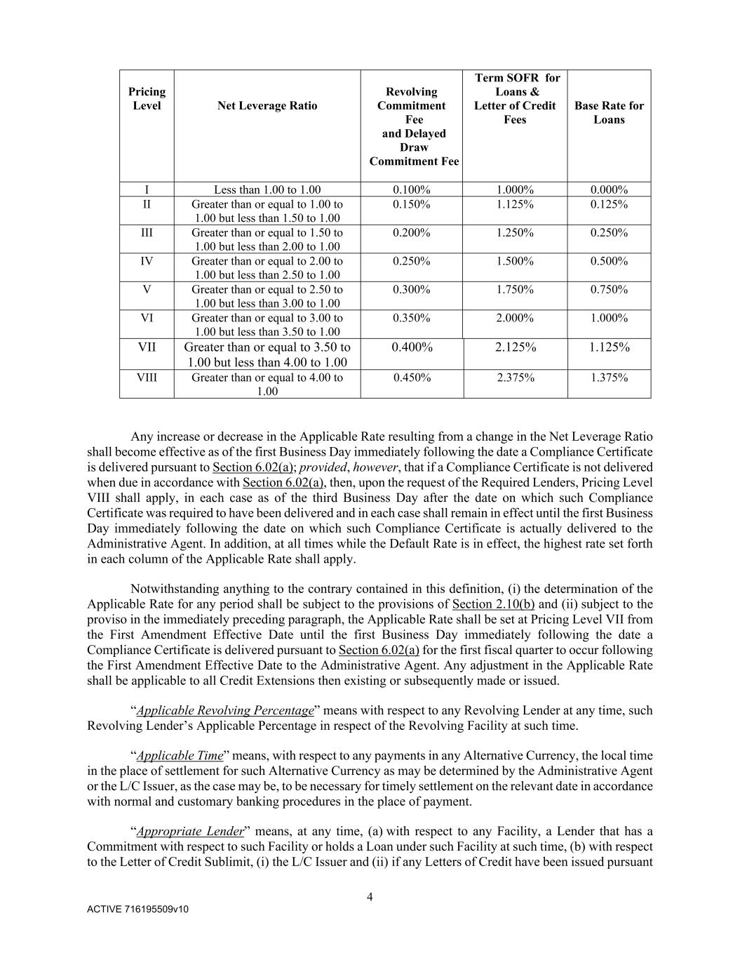 4 ACTIVE 716195509v10 Pricing Level Net Leverage Ratio Revolving Commitment Fee and Delayed Draw Commitment Fee Term SOFR for Loans & Letter of Credit Fees Base Rate for Loans I Less than 1.00 to 1.00 0.100% 1.000% 0.000% II Greater than or equal to 1.00 to 1.00 but less than 1.50 to 1.00 0.150% 1.125% 0.125% III Greater than or equal to 1.50 to 1.00 but less than 2.00 to 1.00 0.200% 1.250% 0.250% IV Greater than or equal to 2.00 to 1.00 but less than 2.50 to 1.00 0.250% 1.500% 0.500% V Greater than or equal to 2.50 to 1.00 but less than 3.00 to 1.00 0.300% 1.750% 0.750% VI Greater than or equal to 3.00 to 1.00 but less than 3.50 to 1.00 0.350% 2.000% 1.000% VII Greater than or equal to 3.50 to 1.00 but less than 4.00 to 1.00 0.400% 2.125% 1.125% VIII Greater than or equal to 4.00 to 1.00 0.450% 2.375% 1.375% Any increase or decrease in the Applicable Rate resulting from a change in the Net Leverage Ratio shall become effective as of the first Business Day immediately following the date a Compliance Certificate is delivered pursuant to Section 6.02(a); provided, however, that if a Compliance Certificate is not delivered when due in accordance with Section 6.02(a), then, upon the request of the Required Lenders, Pricing Level VIII shall apply, in each case as of the third Business Day after the date on which such Compliance Certificate was required to have been delivered and in each case shall remain in effect until the first Business Day immediately following the date on which such Compliance Certificate is actually delivered to the Administrative Agent. In addition, at all times while the Default Rate is in effect, the highest rate set forth in each column of the Applicable Rate shall apply. Notwithstanding anything to the contrary contained in this definition, (i) the determination of the Applicable Rate for any period shall be subject to the provisions of Section 2.10(b) and (ii) subject to the proviso in the immediately preceding paragraph, the Applicable Rate shall be set at Pricing Level VII from the First Amendment Effective Date until the first Business Day immediately following the date a Compliance Certificate is delivered pursuant to Section 6.02(a) for the first fiscal quarter to occur following the First Amendment Effective Date to the Administrative Agent. Any adjustment in the Applicable Rate shall be applicable to all Credit Extensions then existing or subsequently made or issued. “Applicable Revolving Percentage” means with respect to any Revolving Lender at any time, such Revolving Lender’s Applicable Percentage in respect of the Revolving Facility at such time. “Applicable Time” means, with respect to any payments in any Alternative Currency, the local time in the place of settlement for such Alternative Currency as may be determined by the Administrative Agent or the L/C Issuer, as the case may be, to be necessary for timely settlement on the relevant date in accordance with normal and customary banking procedures in the place of payment. “Appropriate Lender” means, at any time, (a) with respect to any Facility, a Lender that has a Commitment with respect to such Facility or holds a Loan under such Facility at such time, (b) with respect to the Letter of Credit Sublimit, (i) the L/C Issuer and (ii) if any Letters of Credit have been issued pursuant