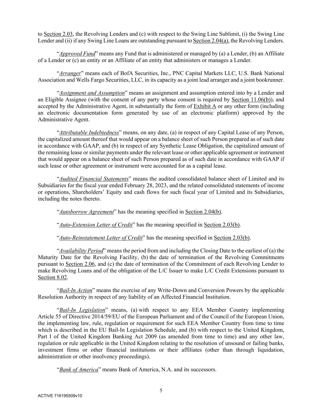 5 ACTIVE 716195509v10 to Section 2.03, the Revolving Lenders and (c) with respect to the Swing Line Sublimit, (i) the Swing Line Lender and (ii) if any Swing Line Loans are outstanding pursuant to Section 2.04(a), the Revolving Lenders. “Approved Fund” means any Fund that is administered or managed by (a) a Lender, (b) an Affiliate of a Lender or (c) an entity or an Affiliate of an entity that administers or manages a Lender. “Arranger” means each of BofA Securities, Inc., PNC Capital Markets LLC, U.S. Bank National Association and Wells Fargo Securities, LLC, in its capacity as a joint lead arranger and a joint bookrunner. “Assignment and Assumption” means an assignment and assumption entered into by a Lender and an Eligible Assignee (with the consent of any party whose consent is required by Section 11.06(b)), and accepted by the Administrative Agent, in substantially the form of Exhibit A or any other form (including an electronic documentation form generated by use of an electronic platform) approved by the Administrative Agent. “Attributable Indebtedness” means, on any date, (a) in respect of any Capital Lease of any Person, the capitalized amount thereof that would appear on a balance sheet of such Person prepared as of such date in accordance with GAAP, and (b) in respect of any Synthetic Lease Obligation, the capitalized amount of the remaining lease or similar payments under the relevant lease or other applicable agreement or instrument that would appear on a balance sheet of such Person prepared as of such date in accordance with GAAP if such lease or other agreement or instrument were accounted for as a capital lease. “Audited Financial Statements” means the audited consolidated balance sheet of Limited and its Subsidiaries for the fiscal year ended February 28, 2023, and the related consolidated statements of income or operations, Shareholders’ Equity and cash flows for such fiscal year of Limited and its Subsidiaries, including the notes thereto. “Autoborrow Agreement” has the meaning specified in Section 2.04(b). “Auto-Extension Letter of Credit” has the meaning specified in Section 2.03(b). “Auto-Reinstatement Letter of Credit” has the meaning specified in Section 2.03(b). “Availability Period” means the period from and including the Closing Date to the earliest of (a) the Maturity Date for the Revolving Facility, (b) the date of termination of the Revolving Commitments pursuant to Section 2.06, and (c) the date of termination of the Commitment of each Revolving Lender to make Revolving Loans and of the obligation of the L/C Issuer to make L/C Credit Extensions pursuant to Section 8.02. “Bail-In Action” means the exercise of any Write-Down and Conversion Powers by the applicable Resolution Authority in respect of any liability of an Affected Financial Institution. “Bail-In Legislation” means, (a) with respect to any EEA Member Country implementing Article 55 of Directive 2014/59/EU of the European Parliament and of the Council of the European Union, the implementing law, rule, regulation or requirement for such EEA Member Country from time to time which is described in the EU Bail-In Legislation Schedule, and (b) with respect to the United Kingdom, Part I of the United Kingdom Banking Act 2009 (as amended from time to time) and any other law, regulation or rule applicable in the United Kingdom relating to the resolution of unsound or failing banks, investment firms or other financial institutions or their affiliates (other than through liquidation, administration or other insolvency proceedings). “Bank of America” means Bank of America, N.A. and its successors.
