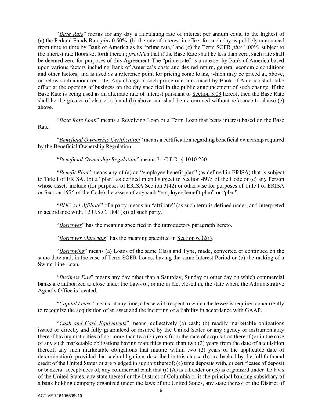 6 ACTIVE 716195509v10 “Base Rate” means for any day a fluctuating rate of interest per annum equal to the highest of (a) the Federal Funds Rate plus 0.50%, (b) the rate of interest in effect for such day as publicly announced from time to time by Bank of America as its “prime rate,” and (c) the Term SOFR plus 1.00%, subject to the interest rate floors set forth therein; provided that if the Base Rate shall be less than zero, such rate shall be deemed zero for purposes of this Agreement. The “prime rate” is a rate set by Bank of America based upon various factors including Bank of America’s costs and desired return, general economic conditions and other factors, and is used as a reference point for pricing some loans, which may be priced at, above, or below such announced rate. Any change in such prime rate announced by Bank of America shall take effect at the opening of business on the day specified in the public announcement of such change. If the Base Rate is being used as an alternate rate of interest pursuant to Section 3.03 hereof, then the Base Rate shall be the greater of clauses (a) and (b) above and shall be determined without reference to clause (c) above. “Base Rate Loan” means a Revolving Loan or a Term Loan that bears interest based on the Base Rate. “Beneficial Ownership Certification” means a certification regarding beneficial ownership required by the Beneficial Ownership Regulation. “Beneficial Ownership Regulation” means 31 C.F.R. § 1010.230. “Benefit Plan” means any of (a) an “employee benefit plan” (as defined in ERISA) that is subject to Title I of ERISA, (b) a “plan” as defined in and subject to Section 4975 of the Code or (c) any Person whose assets include (for purposes of ERISA Section 3(42) or otherwise for purposes of Title I of ERISA or Section 4975 of the Code) the assets of any such “employee benefit plan” or “plan”. “BHC Act Affiliate” of a party means an “affiliate” (as such term is defined under, and interpreted in accordance with, 12 U.S.C. 1841(k)) of such party. “Borrower” has the meaning specified in the introductory paragraph hereto. “Borrower Materials” has the meaning specified in Section 6.02(i). “Borrowing” means (a) Loans of the same Class and Type, made, converted or continued on the same date and, in the case of Term SOFR Loans, having the same Interest Period or (b) the making of a Swing Line Loan. “Business Day” means any day other than a Saturday, Sunday or other day on which commercial banks are authorized to close under the Laws of, or are in fact closed in, the state where the Administrative Agent’s Office is located. “Capital Lease” means, at any time, a lease with respect to which the lessee is required concurrently to recognize the acquisition of an asset and the incurring of a liability in accordance with GAAP. “Cash and Cash Equivalents” means, collectively (a) cash; (b) readily marketable obligations issued or directly and fully guaranteed or insured by the United States or any agency or instrumentality thereof having maturities of not more than two (2) years from the date of acquisition thereof (or in the case of any such marketable obligations having maturities more than two (2) years from the date of acquisition thereof, any such marketable obligations that mature within two (2) years of the applicable date of determination); provided that such obligations described in this clause (b) are backed by the full faith and credit of the United States or are pledged in support thereof; (c) time deposits with, or certificates of deposit or bankers’ acceptances of, any commercial bank that (i) (A) is a Lender or (B) is organized under the laws of the United States, any state thereof or the District of Columbia or is the principal banking subsidiary of a bank holding company organized under the laws of the United States, any state thereof or the District of