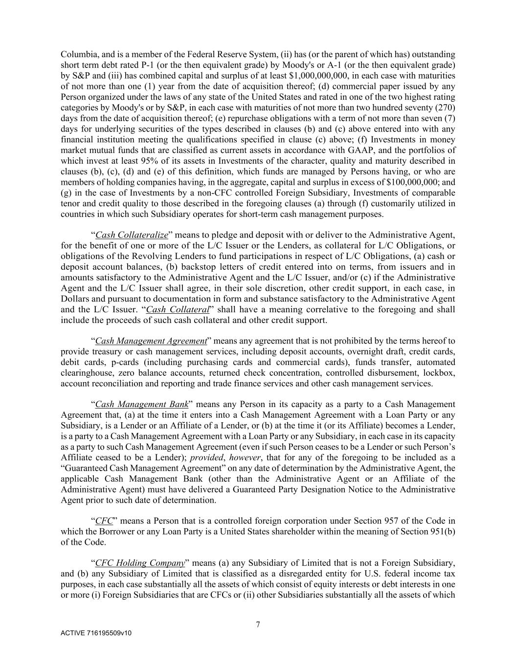 7 ACTIVE 716195509v10 Columbia, and is a member of the Federal Reserve System, (ii) has (or the parent of which has) outstanding short term debt rated P-1 (or the then equivalent grade) by Moody's or A-1 (or the then equivalent grade) by S&P and (iii) has combined capital and surplus of at least $1,000,000,000, in each case with maturities of not more than one (1) year from the date of acquisition thereof; (d) commercial paper issued by any Person organized under the laws of any state of the United States and rated in one of the two highest rating categories by Moody's or by S&P, in each case with maturities of not more than two hundred seventy (270) days from the date of acquisition thereof; (e) repurchase obligations with a term of not more than seven (7) days for underlying securities of the types described in clauses (b) and (c) above entered into with any financial institution meeting the qualifications specified in clause (c) above; (f) Investments in money market mutual funds that are classified as current assets in accordance with GAAP, and the portfolios of which invest at least 95% of its assets in Investments of the character, quality and maturity described in clauses (b), (c), (d) and (e) of this definition, which funds are managed by Persons having, or who are members of holding companies having, in the aggregate, capital and surplus in excess of $100,000,000; and (g) in the case of Investments by a non-CFC controlled Foreign Subsidiary, Investments of comparable tenor and credit quality to those described in the foregoing clauses (a) through (f) customarily utilized in countries in which such Subsidiary operates for short-term cash management purposes. “Cash Collateralize” means to pledge and deposit with or deliver to the Administrative Agent, for the benefit of one or more of the L/C Issuer or the Lenders, as collateral for L/C Obligations, or obligations of the Revolving Lenders to fund participations in respect of L/C Obligations, (a) cash or deposit account balances, (b) backstop letters of credit entered into on terms, from issuers and in amounts satisfactory to the Administrative Agent and the L/C Issuer, and/or (c) if the Administrative Agent and the L/C Issuer shall agree, in their sole discretion, other credit support, in each case, in Dollars and pursuant to documentation in form and substance satisfactory to the Administrative Agent and the L/C Issuer. “Cash Collateral” shall have a meaning correlative to the foregoing and shall include the proceeds of such cash collateral and other credit support. “Cash Management Agreement” means any agreement that is not prohibited by the terms hereof to provide treasury or cash management services, including deposit accounts, overnight draft, credit cards, debit cards, p-cards (including purchasing cards and commercial cards), funds transfer, automated clearinghouse, zero balance accounts, returned check concentration, controlled disbursement, lockbox, account reconciliation and reporting and trade finance services and other cash management services. “Cash Management Bank” means any Person in its capacity as a party to a Cash Management Agreement that, (a) at the time it enters into a Cash Management Agreement with a Loan Party or any Subsidiary, is a Lender or an Affiliate of a Lender, or (b) at the time it (or its Affiliate) becomes a Lender, is a party to a Cash Management Agreement with a Loan Party or any Subsidiary, in each case in its capacity as a party to such Cash Management Agreement (even if such Person ceases to be a Lender or such Person’s Affiliate ceased to be a Lender); provided, however, that for any of the foregoing to be included as a “Guaranteed Cash Management Agreement” on any date of determination by the Administrative Agent, the applicable Cash Management Bank (other than the Administrative Agent or an Affiliate of the Administrative Agent) must have delivered a Guaranteed Party Designation Notice to the Administrative Agent prior to such date of determination. “CFC” means a Person that is a controlled foreign corporation under Section 957 of the Code in which the Borrower or any Loan Party is a United States shareholder within the meaning of Section 951(b) of the Code. “CFC Holding Company” means (a) any Subsidiary of Limited that is not a Foreign Subsidiary, and (b) any Subsidiary of Limited that is classified as a disregarded entity for U.S. federal income tax purposes, in each case substantially all the assets of which consist of equity interests or debt interests in one or more (i) Foreign Subsidiaries that are CFCs or (ii) other Subsidiaries substantially all the assets of which