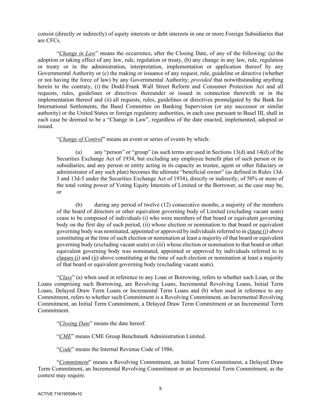 8 ACTIVE 716195509v10 consist (directly or indirectly) of equity interests or debt interests in one or more Foreign Subsidiaries that are CFCs. “Change in Law” means the occurrence, after the Closing Date, of any of the following: (a) the adoption or taking effect of any law, rule, regulation or treaty, (b) any change in any law, rule, regulation or treaty or in the administration, interpretation, implementation or application thereof by any Governmental Authority or (c) the making or issuance of any request, rule, guideline or directive (whether or not having the force of law) by any Governmental Authority; provided that notwithstanding anything herein to the contrary, (i) the Dodd-Frank Wall Street Reform and Consumer Protection Act and all requests, rules, guidelines or directives thereunder or issued in connection therewith or in the implementation thereof and (ii) all requests, rules, guidelines or directives promulgated by the Bank for International Settlements, the Basel Committee on Banking Supervision (or any successor or similar authority) or the United States or foreign regulatory authorities, in each case pursuant to Basel III, shall in each case be deemed to be a “Change in Law”, regardless of the date enacted, implemented, adopted or issued. “Change of Control” means an event or series of events by which: (a) any “person” or “group” (as such terms are used in Sections 13(d) and 14(d) of the Securities Exchange Act of 1934, but excluding any employee benefit plan of such person or its subsidiaries, and any person or entity acting in its capacity as trustee, agent or other fiduciary or administrator of any such plan) becomes the ultimate “beneficial owner” (as defined in Rules 13d- 3 and 13d-5 under the Securities Exchange Act of 1934), directly or indirectly, of 50% or more of the total voting power of Voting Equity Interests of Limited or the Borrower, as the case may be, or (b) during any period of twelve (12) consecutive months, a majority of the members of the board of directors or other equivalent governing body of Limited (excluding vacant seats) cease to be composed of individuals (i) who were members of that board or equivalent governing body on the first day of such period, (ii) whose election or nomination to that board or equivalent governing body was nominated, appointed or approved by individuals referred to in clause (i) above constituting at the time of such election or nomination at least a majority of that board or equivalent governing body (excluding vacant seats) or (iii) whose election or nomination to that board or other equivalent governing body was nominated, appointed or approved by individuals referred to in clauses (i) and (ii) above constituting at the time of such election or nomination at least a majority of that board or equivalent governing body (excluding vacant seats). “Class” (a) when used in reference to any Loan or Borrowing, refers to whether such Loan, or the Loans comprising such Borrowing, are Revolving Loans, Incremental Revolving Loans, Initial Term Loans, Delayed Draw Term Loans or Incremental Term Loans and (b) when used in reference to any Commitment, refers to whether such Commitment is a Revolving Commitment, an Incremental Revolving Commitment, an Initial Term Commitment, a Delayed Draw Term Commitment or an Incremental Term Commitment. “Closing Date” means the date hereof. “CME” means CME Group Benchmark Administration Limited. “Code” means the Internal Revenue Code of 1986. “Commitment” means a Revolving Commitment, an Initial Term Commitment, a Delayed Draw Term Commitment, an Incremental Revolving Commitment or an Incremental Term Commitment, as the context may require.