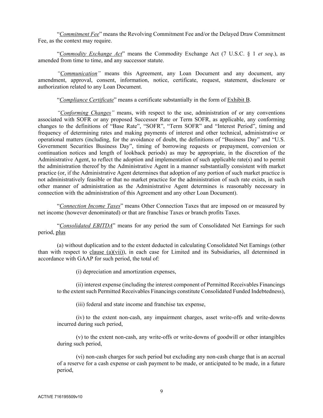 9 ACTIVE 716195509v10 “Commitment Fee” means the Revolving Commitment Fee and/or the Delayed Draw Commitment Fee, as the context may require. “Commodity Exchange Act” means the Commodity Exchange Act (7 U.S.C. § 1 et seq.), as amended from time to time, and any successor statute. “Communication” means this Agreement, any Loan Document and any document, any amendment, approval, consent, information, notice, certificate, request, statement, disclosure or authorization related to any Loan Document. “Compliance Certificate” means a certificate substantially in the form of Exhibit B. “Conforming Changes” means, with respect to the use, administration of or any conventions associated with SOFR or any proposed Successor Rate or Term SOFR, as applicable, any conforming changes to the definitions of “Base Rate”, “SOFR”, “Term SOFR” and “Interest Period”, timing and frequency of determining rates and making payments of interest and other technical, administrative or operational matters (including, for the avoidance of doubt, the definitions of “Business Day” and “U.S. Government Securities Business Day”, timing of borrowing requests or prepayment, conversion or continuation notices and length of lookback periods) as may be appropriate, in the discretion of the Administrative Agent, to reflect the adoption and implementation of such applicable rate(s) and to permit the administration thereof by the Administrative Agent in a manner substantially consistent with market practice (or, if the Administrative Agent determines that adoption of any portion of such market practice is not administratively feasible or that no market practice for the administration of such rate exists, in such other manner of administration as the Administrative Agent determines is reasonably necessary in connection with the administration of this Agreement and any other Loan Document). “Connection Income Taxes” means Other Connection Taxes that are imposed on or measured by net income (however denominated) or that are franchise Taxes or branch profits Taxes. “Consolidated EBITDA” means for any period the sum of Consolidated Net Earnings for such period, plus (a) without duplication and to the extent deducted in calculating Consolidated Net Earnings (other than with respect to clause (a)(vii)), in each case for Limited and its Subsidiaries, all determined in accordance with GAAP for such period, the total of: (i) depreciation and amortization expenses, (ii) interest expense (including the interest component of Permitted Receivables Financings to the extent such Permitted Receivables Financings constitute Consolidated Funded Indebtedness), (iii) federal and state income and franchise tax expense, (iv) to the extent non-cash, any impairment charges, asset write-offs and write-downs incurred during such period, (v) to the extent non-cash, any write-offs or write-downs of goodwill or other intangibles during such period, (vi) non-cash charges for such period but excluding any non-cash charge that is an accrual of a reserve for a cash expense or cash payment to be made, or anticipated to be made, in a future period,