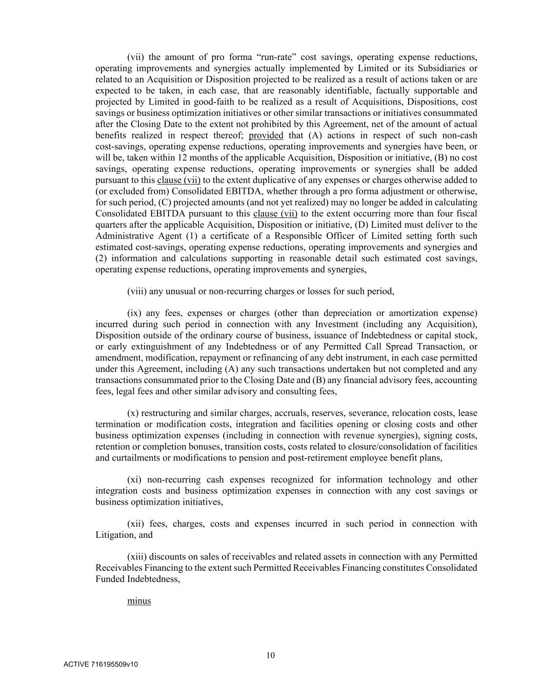 10 ACTIVE 716195509v10 (vii) the amount of pro forma “run-rate” cost savings, operating expense reductions, operating improvements and synergies actually implemented by Limited or its Subsidiaries or related to an Acquisition or Disposition projected to be realized as a result of actions taken or are expected to be taken, in each case, that are reasonably identifiable, factually supportable and projected by Limited in good-faith to be realized as a result of Acquisitions, Dispositions, cost savings or business optimization initiatives or other similar transactions or initiatives consummated after the Closing Date to the extent not prohibited by this Agreement, net of the amount of actual benefits realized in respect thereof; provided that (A) actions in respect of such non-cash cost-savings, operating expense reductions, operating improvements and synergies have been, or will be, taken within 12 months of the applicable Acquisition, Disposition or initiative, (B) no cost savings, operating expense reductions, operating improvements or synergies shall be added pursuant to this clause (vii) to the extent duplicative of any expenses or charges otherwise added to (or excluded from) Consolidated EBITDA, whether through a pro forma adjustment or otherwise, for such period, (C) projected amounts (and not yet realized) may no longer be added in calculating Consolidated EBITDA pursuant to this clause (vii) to the extent occurring more than four fiscal quarters after the applicable Acquisition, Disposition or initiative, (D) Limited must deliver to the Administrative Agent (1) a certificate of a Responsible Officer of Limited setting forth such estimated cost-savings, operating expense reductions, operating improvements and synergies and (2) information and calculations supporting in reasonable detail such estimated cost savings, operating expense reductions, operating improvements and synergies, (viii) any unusual or non-recurring charges or losses for such period, (ix) any fees, expenses or charges (other than depreciation or amortization expense) incurred during such period in connection with any Investment (including any Acquisition), Disposition outside of the ordinary course of business, issuance of Indebtedness or capital stock, or early extinguishment of any Indebtedness or of any Permitted Call Spread Transaction, or amendment, modification, repayment or refinancing of any debt instrument, in each case permitted under this Agreement, including (A) any such transactions undertaken but not completed and any transactions consummated prior to the Closing Date and (B) any financial advisory fees, accounting fees, legal fees and other similar advisory and consulting fees, (x) restructuring and similar charges, accruals, reserves, severance, relocation costs, lease termination or modification costs, integration and facilities opening or closing costs and other business optimization expenses (including in connection with revenue synergies), signing costs, retention or completion bonuses, transition costs, costs related to closure/consolidation of facilities and curtailments or modifications to pension and post-retirement employee benefit plans, (xi) non-recurring cash expenses recognized for information technology and other integration costs and business optimization expenses in connection with any cost savings or business optimization initiatives, (xii) fees, charges, costs and expenses incurred in such period in connection with Litigation, and (xiii) discounts on sales of receivables and related assets in connection with any Permitted Receivables Financing to the extent such Permitted Receivables Financing constitutes Consolidated Funded Indebtedness, minus