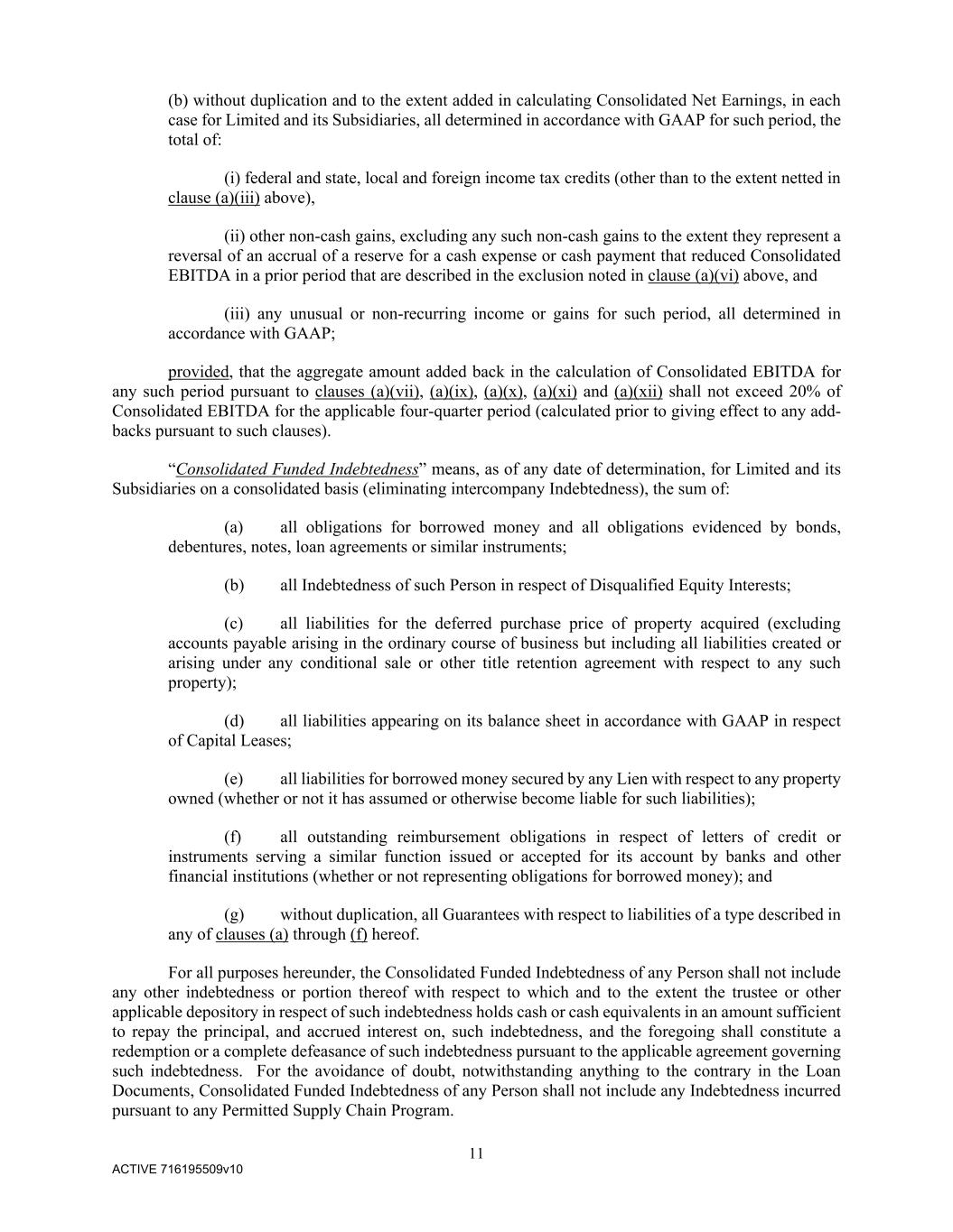 11 ACTIVE 716195509v10 (b) without duplication and to the extent added in calculating Consolidated Net Earnings, in each case for Limited and its Subsidiaries, all determined in accordance with GAAP for such period, the total of: (i) federal and state, local and foreign income tax credits (other than to the extent netted in clause (a)(iii) above), (ii) other non-cash gains, excluding any such non-cash gains to the extent they represent a reversal of an accrual of a reserve for a cash expense or cash payment that reduced Consolidated EBITDA in a prior period that are described in the exclusion noted in clause (a)(vi) above, and (iii) any unusual or non-recurring income or gains for such period, all determined in accordance with GAAP; provided, that the aggregate amount added back in the calculation of Consolidated EBITDA for any such period pursuant to clauses (a)(vii), (a)(ix), (a)(x), (a)(xi) and (a)(xii) shall not exceed 20% of Consolidated EBITDA for the applicable four-quarter period (calculated prior to giving effect to any add- backs pursuant to such clauses). “Consolidated Funded Indebtedness” means, as of any date of determination, for Limited and its Subsidiaries on a consolidated basis (eliminating intercompany Indebtedness), the sum of: (a) all obligations for borrowed money and all obligations evidenced by bonds, debentures, notes, loan agreements or similar instruments; (b) all Indebtedness of such Person in respect of Disqualified Equity Interests; (c) all liabilities for the deferred purchase price of property acquired (excluding accounts payable arising in the ordinary course of business but including all liabilities created or arising under any conditional sale or other title retention agreement with respect to any such property); (d) all liabilities appearing on its balance sheet in accordance with GAAP in respect of Capital Leases; (e) all liabilities for borrowed money secured by any Lien with respect to any property owned (whether or not it has assumed or otherwise become liable for such liabilities); (f) all outstanding reimbursement obligations in respect of letters of credit or instruments serving a similar function issued or accepted for its account by banks and other financial institutions (whether or not representing obligations for borrowed money); and (g) without duplication, all Guarantees with respect to liabilities of a type described in any of clauses (a) through (f) hereof. For all purposes hereunder, the Consolidated Funded Indebtedness of any Person shall not include any other indebtedness or portion thereof with respect to which and to the extent the trustee or other applicable depository in respect of such indebtedness holds cash or cash equivalents in an amount sufficient to repay the principal, and accrued interest on, such indebtedness, and the foregoing shall constitute a redemption or a complete defeasance of such indebtedness pursuant to the applicable agreement governing such indebtedness. For the avoidance of doubt, notwithstanding anything to the contrary in the Loan Documents, Consolidated Funded Indebtedness of any Person shall not include any Indebtedness incurred pursuant to any Permitted Supply Chain Program.