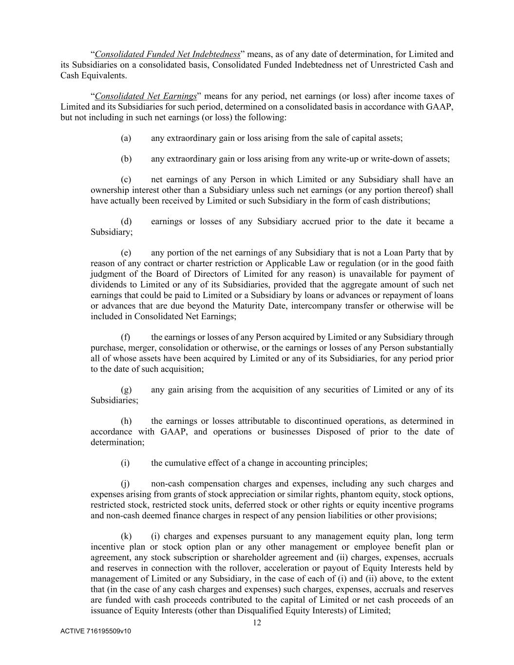 12 ACTIVE 716195509v10 “Consolidated Funded Net Indebtedness” means, as of any date of determination, for Limited and its Subsidiaries on a consolidated basis, Consolidated Funded Indebtedness net of Unrestricted Cash and Cash Equivalents. “Consolidated Net Earnings” means for any period, net earnings (or loss) after income taxes of Limited and its Subsidiaries for such period, determined on a consolidated basis in accordance with GAAP, but not including in such net earnings (or loss) the following: (a) any extraordinary gain or loss arising from the sale of capital assets; (b) any extraordinary gain or loss arising from any write-up or write-down of assets; (c) net earnings of any Person in which Limited or any Subsidiary shall have an ownership interest other than a Subsidiary unless such net earnings (or any portion thereof) shall have actually been received by Limited or such Subsidiary in the form of cash distributions; (d) earnings or losses of any Subsidiary accrued prior to the date it became a Subsidiary; (e) any portion of the net earnings of any Subsidiary that is not a Loan Party that by reason of any contract or charter restriction or Applicable Law or regulation (or in the good faith judgment of the Board of Directors of Limited for any reason) is unavailable for payment of dividends to Limited or any of its Subsidiaries, provided that the aggregate amount of such net earnings that could be paid to Limited or a Subsidiary by loans or advances or repayment of loans or advances that are due beyond the Maturity Date, intercompany transfer or otherwise will be included in Consolidated Net Earnings; (f) the earnings or losses of any Person acquired by Limited or any Subsidiary through purchase, merger, consolidation or otherwise, or the earnings or losses of any Person substantially all of whose assets have been acquired by Limited or any of its Subsidiaries, for any period prior to the date of such acquisition; (g) any gain arising from the acquisition of any securities of Limited or any of its Subsidiaries; (h) the earnings or losses attributable to discontinued operations, as determined in accordance with GAAP, and operations or businesses Disposed of prior to the date of determination; (i) the cumulative effect of a change in accounting principles; (j) non-cash compensation charges and expenses, including any such charges and expenses arising from grants of stock appreciation or similar rights, phantom equity, stock options, restricted stock, restricted stock units, deferred stock or other rights or equity incentive programs and non-cash deemed finance charges in respect of any pension liabilities or other provisions; (k) (i) charges and expenses pursuant to any management equity plan, long term incentive plan or stock option plan or any other management or employee benefit plan or agreement, any stock subscription or shareholder agreement and (ii) charges, expenses, accruals and reserves in connection with the rollover, acceleration or payout of Equity Interests held by management of Limited or any Subsidiary, in the case of each of (i) and (ii) above, to the extent that (in the case of any cash charges and expenses) such charges, expenses, accruals and reserves are funded with cash proceeds contributed to the capital of Limited or net cash proceeds of an issuance of Equity Interests (other than Disqualified Equity Interests) of Limited;