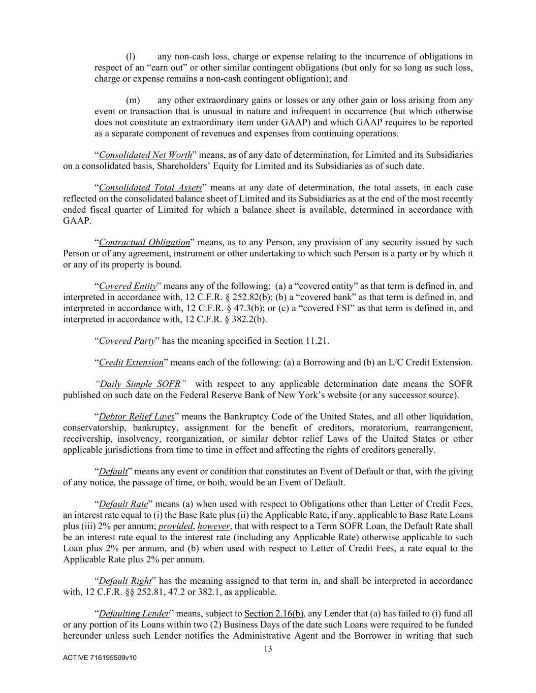 13 ACTIVE 716195509v10 (l) any non-cash loss, charge or expense relating to the incurrence of obligations in respect of an “earn out” or other similar contingent obligations (but only for so long as such loss, charge or expense remains a non-cash contingent obligation); and (m) any other extraordinary gains or losses or any other gain or loss arising from any event or transaction that is unusual in nature and infrequent in occurrence (but which otherwise does not constitute an extraordinary item under GAAP) and which GAAP requires to be reported as a separate component of revenues and expenses from continuing operations. “Consolidated Net Worth” means, as of any date of determination, for Limited and its Subsidiaries on a consolidated basis, Shareholders’ Equity for Limited and its Subsidiaries as of such date. “Consolidated Total Assets” means at any date of determination, the total assets, in each case reflected on the consolidated balance sheet of Limited and its Subsidiaries as at the end of the most recently ended fiscal quarter of Limited for which a balance sheet is available, determined in accordance with GAAP. “Contractual Obligation” means, as to any Person, any provision of any security issued by such Person or of any agreement, instrument or other undertaking to which such Person is a party or by which it or any of its property is bound. “Covered Entity” means any of the following: (a) a “covered entity” as that term is defined in, and interpreted in accordance with, 12 C.F.R. § 252.82(b); (b) a “covered bank” as that term is defined in, and interpreted in accordance with, 12 C.F.R. § 47.3(b); or (c) a “covered FSI” as that term is defined in, and interpreted in accordance with, 12 C.F.R. § 382.2(b). “Covered Party” has the meaning specified in Section 11.21. “Credit Extension” means each of the following: (a) a Borrowing and (b) an L/C Credit Extension. “Daily Simple SOFR” with respect to any applicable determination date means the SOFR published on such date on the Federal Reserve Bank of New York’s website (or any successor source). “Debtor Relief Laws” means the Bankruptcy Code of the United States, and all other liquidation, conservatorship, bankruptcy, assignment for the benefit of creditors, moratorium, rearrangement, receivership, insolvency, reorganization, or similar debtor relief Laws of the United States or other applicable jurisdictions from time to time in effect and affecting the rights of creditors generally. “Default” means any event or condition that constitutes an Event of Default or that, with the giving of any notice, the passage of time, or both, would be an Event of Default. “Default Rate” means (a) when used with respect to Obligations other than Letter of Credit Fees, an interest rate equal to (i) the Base Rate plus (ii) the Applicable Rate, if any, applicable to Base Rate Loans plus (iii) 2% per annum; provided, however, that with respect to a Term SOFR Loan, the Default Rate shall be an interest rate equal to the interest rate (including any Applicable Rate) otherwise applicable to such Loan plus 2% per annum, and (b) when used with respect to Letter of Credit Fees, a rate equal to the Applicable Rate plus 2% per annum. “Default Right” has the meaning assigned to that term in, and shall be interpreted in accordance with, 12 C.F.R. §§ 252.81, 47.2 or 382.1, as applicable. “Defaulting Lender” means, subject to Section 2.16(b), any Lender that (a) has failed to (i) fund all or any portion of its Loans within two (2) Business Days of the date such Loans were required to be funded hereunder unless such Lender notifies the Administrative Agent and the Borrower in writing that such