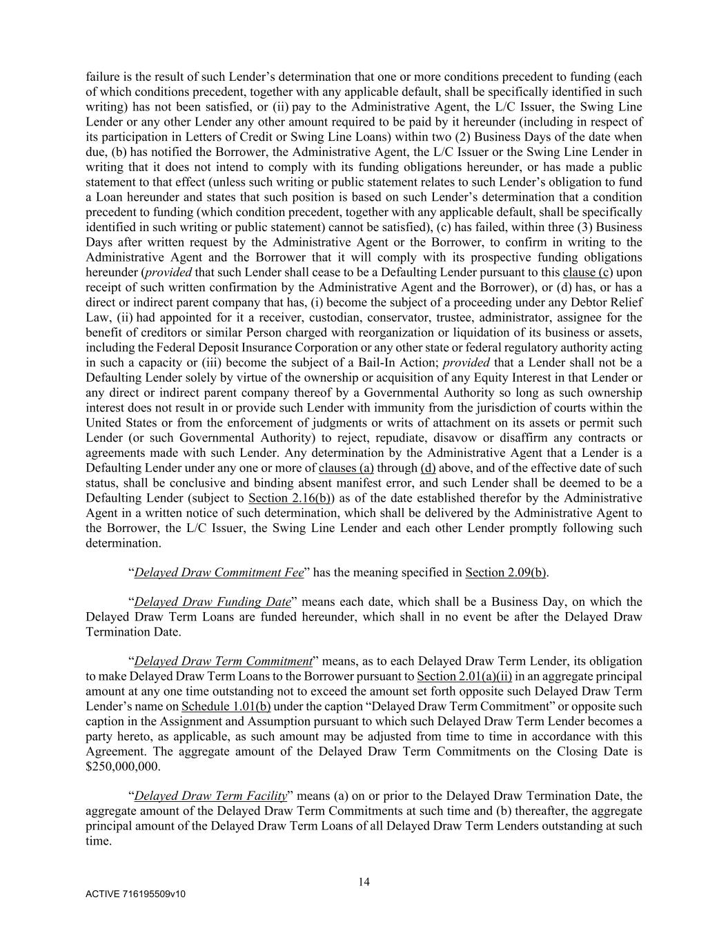 14 ACTIVE 716195509v10 failure is the result of such Lender’s determination that one or more conditions precedent to funding (each of which conditions precedent, together with any applicable default, shall be specifically identified in such writing) has not been satisfied, or (ii) pay to the Administrative Agent, the L/C Issuer, the Swing Line Lender or any other Lender any other amount required to be paid by it hereunder (including in respect of its participation in Letters of Credit or Swing Line Loans) within two (2) Business Days of the date when due, (b) has notified the Borrower, the Administrative Agent, the L/C Issuer or the Swing Line Lender in writing that it does not intend to comply with its funding obligations hereunder, or has made a public statement to that effect (unless such writing or public statement relates to such Lender’s obligation to fund a Loan hereunder and states that such position is based on such Lender’s determination that a condition precedent to funding (which condition precedent, together with any applicable default, shall be specifically identified in such writing or public statement) cannot be satisfied), (c) has failed, within three (3) Business Days after written request by the Administrative Agent or the Borrower, to confirm in writing to the Administrative Agent and the Borrower that it will comply with its prospective funding obligations hereunder (provided that such Lender shall cease to be a Defaulting Lender pursuant to this clause (c) upon receipt of such written confirmation by the Administrative Agent and the Borrower), or (d) has, or has a direct or indirect parent company that has, (i) become the subject of a proceeding under any Debtor Relief Law, (ii) had appointed for it a receiver, custodian, conservator, trustee, administrator, assignee for the benefit of creditors or similar Person charged with reorganization or liquidation of its business or assets, including the Federal Deposit Insurance Corporation or any other state or federal regulatory authority acting in such a capacity or (iii) become the subject of a Bail-In Action; provided that a Lender shall not be a Defaulting Lender solely by virtue of the ownership or acquisition of any Equity Interest in that Lender or any direct or indirect parent company thereof by a Governmental Authority so long as such ownership interest does not result in or provide such Lender with immunity from the jurisdiction of courts within the United States or from the enforcement of judgments or writs of attachment on its assets or permit such Lender (or such Governmental Authority) to reject, repudiate, disavow or disaffirm any contracts or agreements made with such Lender. Any determination by the Administrative Agent that a Lender is a Defaulting Lender under any one or more of clauses (a) through (d) above, and of the effective date of such status, shall be conclusive and binding absent manifest error, and such Lender shall be deemed to be a Defaulting Lender (subject to Section 2.16(b)) as of the date established therefor by the Administrative Agent in a written notice of such determination, which shall be delivered by the Administrative Agent to the Borrower, the L/C Issuer, the Swing Line Lender and each other Lender promptly following such determination. “Delayed Draw Commitment Fee” has the meaning specified in Section 2.09(b). “Delayed Draw Funding Date” means each date, which shall be a Business Day, on which the Delayed Draw Term Loans are funded hereunder, which shall in no event be after the Delayed Draw Termination Date. “Delayed Draw Term Commitment” means, as to each Delayed Draw Term Lender, its obligation to make Delayed Draw Term Loans to the Borrower pursuant to Section 2.01(a)(ii) in an aggregate principal amount at any one time outstanding not to exceed the amount set forth opposite such Delayed Draw Term Lender’s name on Schedule 1.01(b) under the caption “Delayed Draw Term Commitment” or opposite such caption in the Assignment and Assumption pursuant to which such Delayed Draw Term Lender becomes a party hereto, as applicable, as such amount may be adjusted from time to time in accordance with this Agreement. The aggregate amount of the Delayed Draw Term Commitments on the Closing Date is $250,000,000. “Delayed Draw Term Facility” means (a) on or prior to the Delayed Draw Termination Date, the aggregate amount of the Delayed Draw Term Commitments at such time and (b) thereafter, the aggregate principal amount of the Delayed Draw Term Loans of all Delayed Draw Term Lenders outstanding at such time.