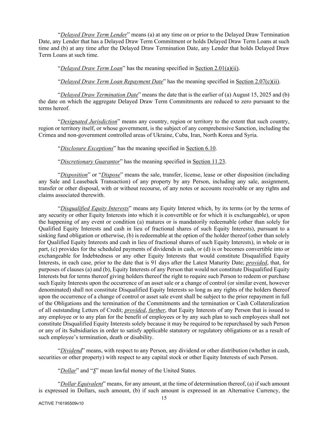 15 ACTIVE 716195509v10 “Delayed Draw Term Lender” means (a) at any time on or prior to the Delayed Draw Termination Date, any Lender that has a Delayed Draw Term Commitment or holds Delayed Draw Term Loans at such time and (b) at any time after the Delayed Draw Termination Date, any Lender that holds Delayed Draw Term Loans at such time. “Delayed Draw Term Loan” has the meaning specified in Section 2.01(a)(ii). “Delayed Draw Term Loan Repayment Date” has the meaning specified in Section 2.07(c)(ii). “Delayed Draw Termination Date” means the date that is the earlier of (a) August 15, 2025 and (b) the date on which the aggregate Delayed Draw Term Commitments are reduced to zero pursuant to the terms hereof. “Designated Jurisdiction” means any country, region or territory to the extent that such country, region or territory itself, or whose government, is the subject of any comprehensive Sanction, including the Crimea and non-government controlled areas of Ukraine, Cuba, Iran, North Korea and Syria. “Disclosure Exceptions” has the meaning specified in Section 6.10. “Discretionary Guarantor” has the meaning specified in Section 11.23. “Disposition” or “Dispose” means the sale, transfer, license, lease or other disposition (including any Sale and Leaseback Transaction) of any property by any Person, including any sale, assignment, transfer or other disposal, with or without recourse, of any notes or accounts receivable or any rights and claims associated therewith. “Disqualified Equity Interests” means any Equity Interest which, by its terms (or by the terms of any security or other Equity Interests into which it is convertible or for which it is exchangeable), or upon the happening of any event or condition (a) matures or is mandatorily redeemable (other than solely for Qualified Equity Interests and cash in lieu of fractional shares of such Equity Interests), pursuant to a sinking fund obligation or otherwise, (b) is redeemable at the option of the holder thereof (other than solely for Qualified Equity Interests and cash in lieu of fractional shares of such Equity Interests), in whole or in part, (c) provides for the scheduled payments of dividends in cash, or (d) is or becomes convertible into or exchangeable for Indebtedness or any other Equity Interests that would constitute Disqualified Equity Interests, in each case, prior to the date that is 91 days after the Latest Maturity Date; provided, that, for purposes of clauses (a) and (b), Equity Interests of any Person that would not constitute Disqualified Equity Interests but for terms thereof giving holders thereof the right to require such Person to redeem or purchase such Equity Interests upon the occurrence of an asset sale or a change of control (or similar event, however denominated) shall not constitute Disqualified Equity Interests so long as any rights of the holders thereof upon the occurrence of a change of control or asset sale event shall be subject to the prior repayment in full of the Obligations and the termination of the Commitments and the termination or Cash Collateralization of all outstanding Letters of Credit; provided, further, that Equity Interests of any Person that is issued to any employee or to any plan for the benefit of employees or by any such plan to such employees shall not constitute Disqualified Equity Interests solely because it may be required to be repurchased by such Person or any of its Subsidiaries in order to satisfy applicable statutory or regulatory obligations or as a result of such employee’s termination, death or disability. “Dividend” means, with respect to any Person, any dividend or other distribution (whether in cash, securities or other property) with respect to any capital stock or other Equity Interests of such Person. “Dollar” and “$” mean lawful money of the United States. “Dollar Equivalent” means, for any amount, at the time of determination thereof, (a) if such amount is expressed in Dollars, such amount, (b) if such amount is expressed in an Alternative Currency, the