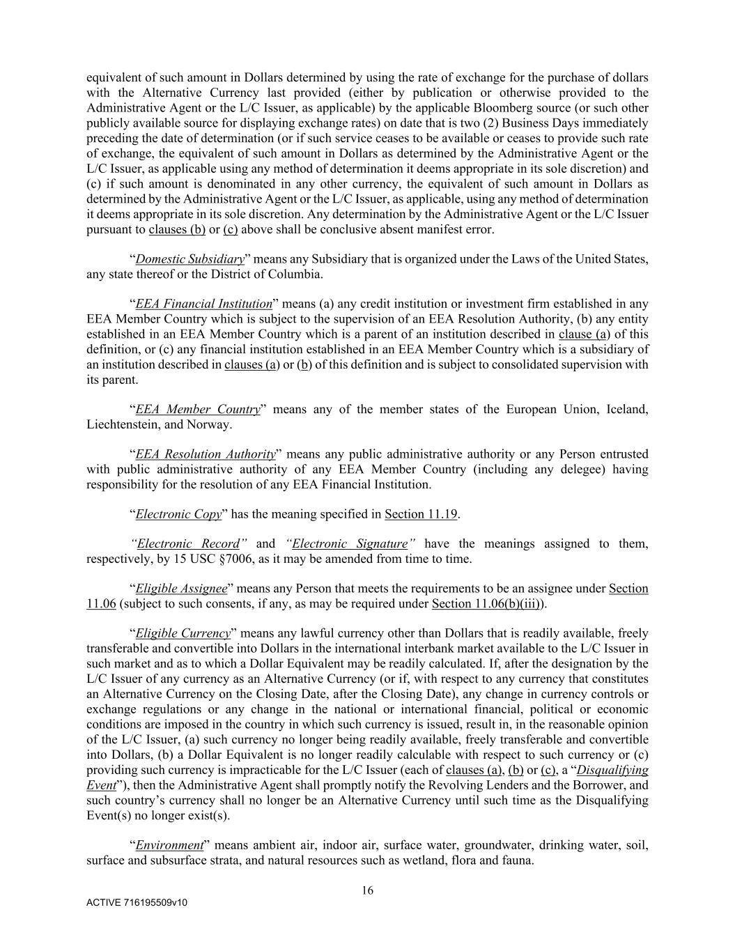 16 ACTIVE 716195509v10 equivalent of such amount in Dollars determined by using the rate of exchange for the purchase of dollars with the Alternative Currency last provided (either by publication or otherwise provided to the Administrative Agent or the L/C Issuer, as applicable) by the applicable Bloomberg source (or such other publicly available source for displaying exchange rates) on date that is two (2) Business Days immediately preceding the date of determination (or if such service ceases to be available or ceases to provide such rate of exchange, the equivalent of such amount in Dollars as determined by the Administrative Agent or the L/C Issuer, as applicable using any method of determination it deems appropriate in its sole discretion) and (c) if such amount is denominated in any other currency, the equivalent of such amount in Dollars as determined by the Administrative Agent or the L/C Issuer, as applicable, using any method of determination it deems appropriate in its sole discretion. Any determination by the Administrative Agent or the L/C Issuer pursuant to clauses (b) or (c) above shall be conclusive absent manifest error. “Domestic Subsidiary” means any Subsidiary that is organized under the Laws of the United States, any state thereof or the District of Columbia. “EEA Financial Institution” means (a) any credit institution or investment firm established in any EEA Member Country which is subject to the supervision of an EEA Resolution Authority, (b) any entity established in an EEA Member Country which is a parent of an institution described in clause (a) of this definition, or (c) any financial institution established in an EEA Member Country which is a subsidiary of an institution described in clauses (a) or (b) of this definition and is subject to consolidated supervision with its parent. “EEA Member Country” means any of the member states of the European Union, Iceland, Liechtenstein, and Norway. “EEA Resolution Authority” means any public administrative authority or any Person entrusted with public administrative authority of any EEA Member Country (including any delegee) having responsibility for the resolution of any EEA Financial Institution. “Electronic Copy” has the meaning specified in Section 11.19. “Electronic Record” and “Electronic Signature” have the meanings assigned to them, respectively, by 15 USC §7006, as it may be amended from time to time. “Eligible Assignee” means any Person that meets the requirements to be an assignee under Section 11.06 (subject to such consents, if any, as may be required under Section 11.06(b)(iii)). “Eligible Currency” means any lawful currency other than Dollars that is readily available, freely transferable and convertible into Dollars in the international interbank market available to the L/C Issuer in such market and as to which a Dollar Equivalent may be readily calculated. If, after the designation by the L/C Issuer of any currency as an Alternative Currency (or if, with respect to any currency that constitutes an Alternative Currency on the Closing Date, after the Closing Date), any change in currency controls or exchange regulations or any change in the national or international financial, political or economic conditions are imposed in the country in which such currency is issued, result in, in the reasonable opinion of the L/C Issuer, (a) such currency no longer being readily available, freely transferable and convertible into Dollars, (b) a Dollar Equivalent is no longer readily calculable with respect to such currency or (c) providing such currency is impracticable for the L/C Issuer (each of clauses (a), (b) or (c), a “Disqualifying Event”), then the Administrative Agent shall promptly notify the Revolving Lenders and the Borrower, and such country’s currency shall no longer be an Alternative Currency until such time as the Disqualifying Event(s) no longer exist(s). “Environment” means ambient air, indoor air, surface water, groundwater, drinking water, soil, surface and subsurface strata, and natural resources such as wetland, flora and fauna.