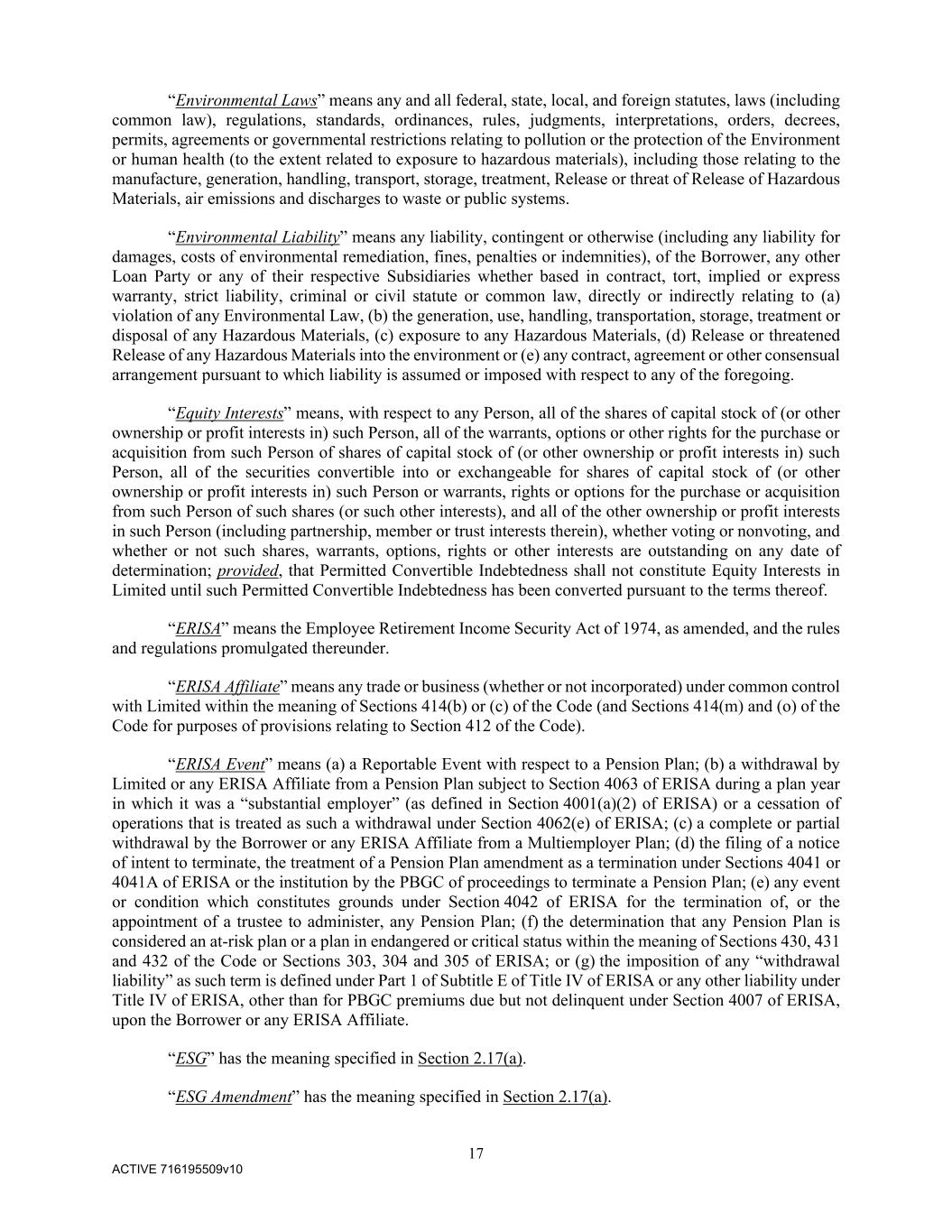 17 ACTIVE 716195509v10 “Environmental Laws” means any and all federal, state, local, and foreign statutes, laws (including common law), regulations, standards, ordinances, rules, judgments, interpretations, orders, decrees, permits, agreements or governmental restrictions relating to pollution or the protection of the Environment or human health (to the extent related to exposure to hazardous materials), including those relating to the manufacture, generation, handling, transport, storage, treatment, Release or threat of Release of Hazardous Materials, air emissions and discharges to waste or public systems. “Environmental Liability” means any liability, contingent or otherwise (including any liability for damages, costs of environmental remediation, fines, penalties or indemnities), of the Borrower, any other Loan Party or any of their respective Subsidiaries whether based in contract, tort, implied or express warranty, strict liability, criminal or civil statute or common law, directly or indirectly relating to (a) violation of any Environmental Law, (b) the generation, use, handling, transportation, storage, treatment or disposal of any Hazardous Materials, (c) exposure to any Hazardous Materials, (d) Release or threatened Release of any Hazardous Materials into the environment or (e) any contract, agreement or other consensual arrangement pursuant to which liability is assumed or imposed with respect to any of the foregoing. “Equity Interests” means, with respect to any Person, all of the shares of capital stock of (or other ownership or profit interests in) such Person, all of the warrants, options or other rights for the purchase or acquisition from such Person of shares of capital stock of (or other ownership or profit interests in) such Person, all of the securities convertible into or exchangeable for shares of capital stock of (or other ownership or profit interests in) such Person or warrants, rights or options for the purchase or acquisition from such Person of such shares (or such other interests), and all of the other ownership or profit interests in such Person (including partnership, member or trust interests therein), whether voting or nonvoting, and whether or not such shares, warrants, options, rights or other interests are outstanding on any date of determination; provided, that Permitted Convertible Indebtedness shall not constitute Equity Interests in Limited until such Permitted Convertible Indebtedness has been converted pursuant to the terms thereof. “ERISA” means the Employee Retirement Income Security Act of 1974, as amended, and the rules and regulations promulgated thereunder. “ERISA Affiliate” means any trade or business (whether or not incorporated) under common control with Limited within the meaning of Sections 414(b) or (c) of the Code (and Sections 414(m) and (o) of the Code for purposes of provisions relating to Section 412 of the Code). “ERISA Event” means (a) a Reportable Event with respect to a Pension Plan; (b) a withdrawal by Limited or any ERISA Affiliate from a Pension Plan subject to Section 4063 of ERISA during a plan year in which it was a “substantial employer” (as defined in Section 4001(a)(2) of ERISA) or a cessation of operations that is treated as such a withdrawal under Section 4062(e) of ERISA; (c) a complete or partial withdrawal by the Borrower or any ERISA Affiliate from a Multiemployer Plan; (d) the filing of a notice of intent to terminate, the treatment of a Pension Plan amendment as a termination under Sections 4041 or 4041A of ERISA or the institution by the PBGC of proceedings to terminate a Pension Plan; (e) any event or condition which constitutes grounds under Section 4042 of ERISA for the termination of, or the appointment of a trustee to administer, any Pension Plan; (f) the determination that any Pension Plan is considered an at-risk plan or a plan in endangered or critical status within the meaning of Sections 430, 431 and 432 of the Code or Sections 303, 304 and 305 of ERISA; or (g) the imposition of any “withdrawal liability” as such term is defined under Part 1 of Subtitle E of Title IV of ERISA or any other liability under Title IV of ERISA, other than for PBGC premiums due but not delinquent under Section 4007 of ERISA, upon the Borrower or any ERISA Affiliate. “ESG” has the meaning specified in Section 2.17(a). “ESG Amendment” has the meaning specified in Section 2.17(a).