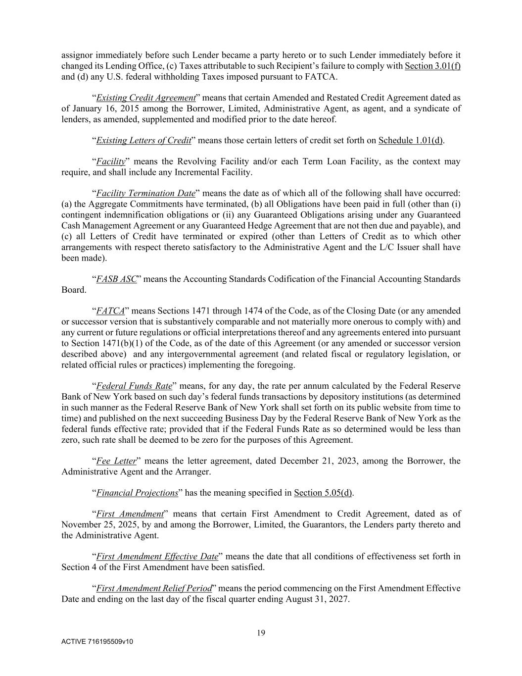 19 ACTIVE 716195509v10 assignor immediately before such Lender became a party hereto or to such Lender immediately before it changed its Lending Office, (c) Taxes attributable to such Recipient’s failure to comply with Section 3.01(f) and (d) any U.S. federal withholding Taxes imposed pursuant to FATCA. “Existing Credit Agreement” means that certain Amended and Restated Credit Agreement dated as of January 16, 2015 among the Borrower, Limited, Administrative Agent, as agent, and a syndicate of lenders, as amended, supplemented and modified prior to the date hereof. “Existing Letters of Credit” means those certain letters of credit set forth on Schedule 1.01(d). “Facility” means the Revolving Facility and/or each Term Loan Facility, as the context may require, and shall include any Incremental Facility. “Facility Termination Date” means the date as of which all of the following shall have occurred: (a) the Aggregate Commitments have terminated, (b) all Obligations have been paid in full (other than (i) contingent indemnification obligations or (ii) any Guaranteed Obligations arising under any Guaranteed Cash Management Agreement or any Guaranteed Hedge Agreement that are not then due and payable), and (c) all Letters of Credit have terminated or expired (other than Letters of Credit as to which other arrangements with respect thereto satisfactory to the Administrative Agent and the L/C Issuer shall have been made). “FASB ASC” means the Accounting Standards Codification of the Financial Accounting Standards Board. “FATCA” means Sections 1471 through 1474 of the Code, as of the Closing Date (or any amended or successor version that is substantively comparable and not materially more onerous to comply with) and any current or future regulations or official interpretations thereof and any agreements entered into pursuant to Section 1471(b)(1) of the Code, as of the date of this Agreement (or any amended or successor version described above) and any intergovernmental agreement (and related fiscal or regulatory legislation, or related official rules or practices) implementing the foregoing. “Federal Funds Rate” means, for any day, the rate per annum calculated by the Federal Reserve Bank of New York based on such day’s federal funds transactions by depository institutions (as determined in such manner as the Federal Reserve Bank of New York shall set forth on its public website from time to time) and published on the next succeeding Business Day by the Federal Reserve Bank of New York as the federal funds effective rate; provided that if the Federal Funds Rate as so determined would be less than zero, such rate shall be deemed to be zero for the purposes of this Agreement. “Fee Letter” means the letter agreement, dated December 21, 2023, among the Borrower, the Administrative Agent and the Arranger. “Financial Projections” has the meaning specified in Section 5.05(d). “First Amendment” means that certain First Amendment to Credit Agreement, dated as of November 25, 2025, by and among the Borrower, Limited, the Guarantors, the Lenders party thereto and the Administrative Agent. “First Amendment Effective Date” means the date that all conditions of effectiveness set forth in Section 4 of the First Amendment have been satisfied. “First Amendment Relief Period” means the period commencing on the First Amendment Effective Date and ending on the last day of the fiscal quarter ending August 31, 2027.